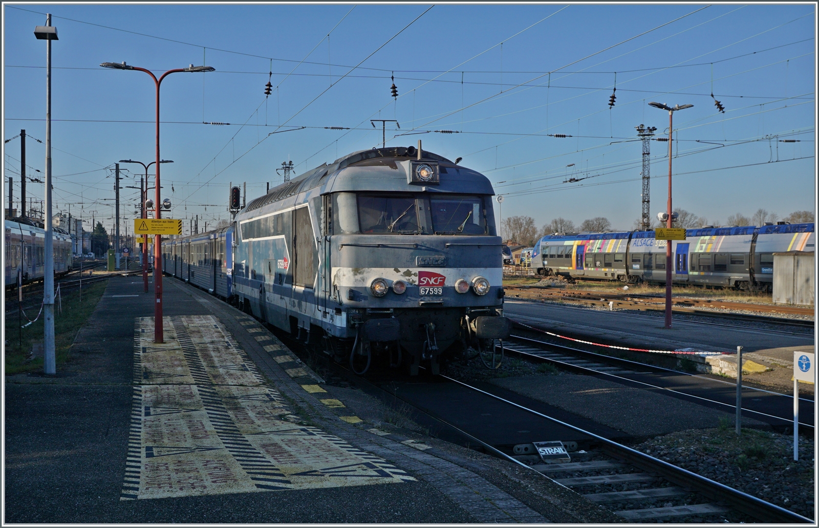 Die weiterhin in einem nicht sehr gepflegten Zustand erscheinende SNCF BB 67591 erreicht mit einem TER Strasbourg. Links im Bild ist noch ein ankommender SNCF InOui TGV zu erkennen.