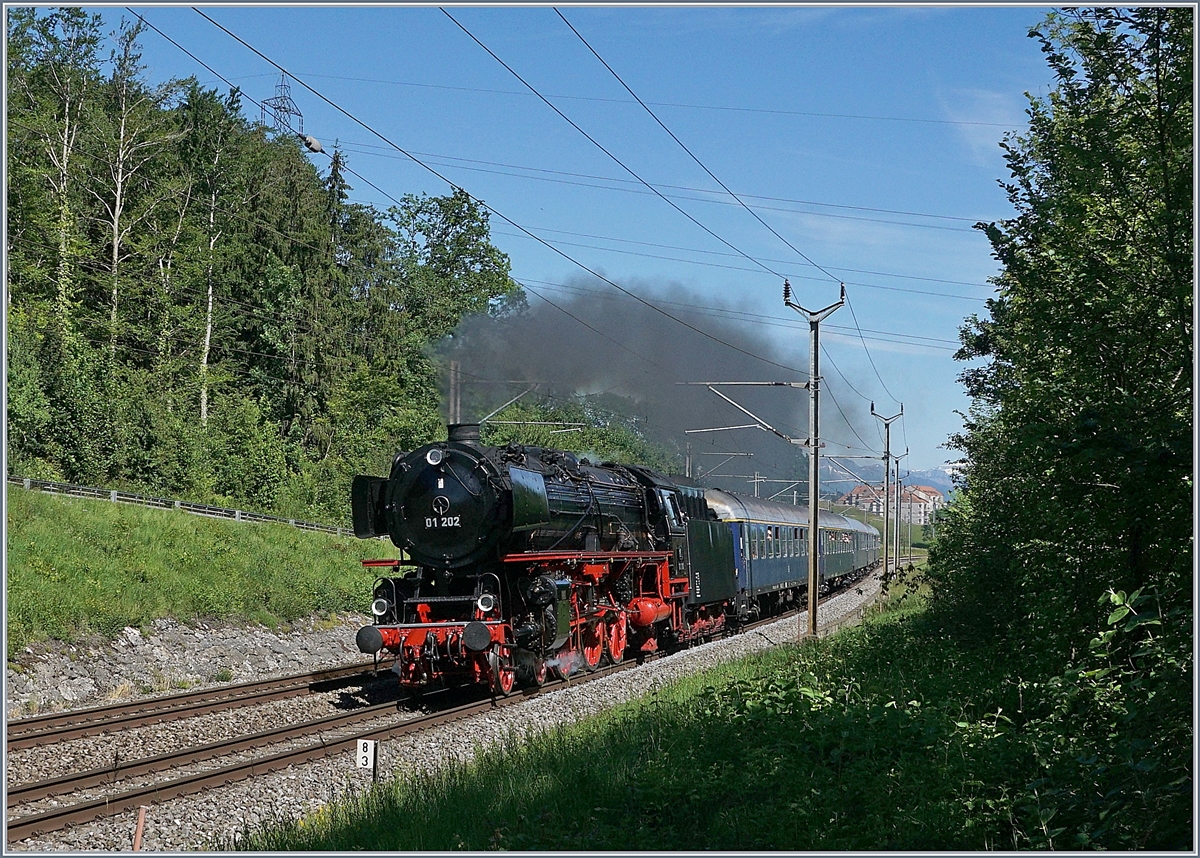Die 01 202 eilt mit ihrem wunderschönen blauen Zug pünktlich wie die Eisenbahn kurz nach Bussigny an mir vorbei. Die Dampflok und ihre Wagenpark sind auf der Fahrt von Genève nach Lyss (via Biel. 8. Juni 2019