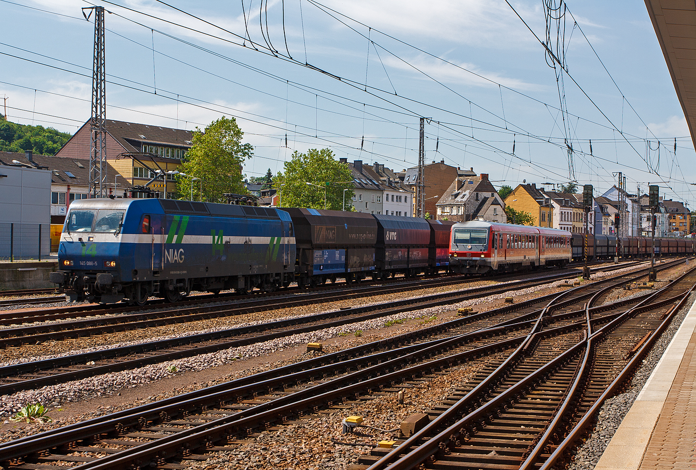 Die NIAG "14" (145 086-5 gemietet von MRCE Dispolok), ex SBB Cargo Re 481 004-0, ex MThB Re 486 654-7, fährt am 17 Juni 2013, mit einem Ganzzug Selbstentladewagen der Bauart Falns, durch den Hauptbahnhof Trier in Koblenz. Davor steht der Trabbi 628 455 / 928 455 der DB Regio Mitte.