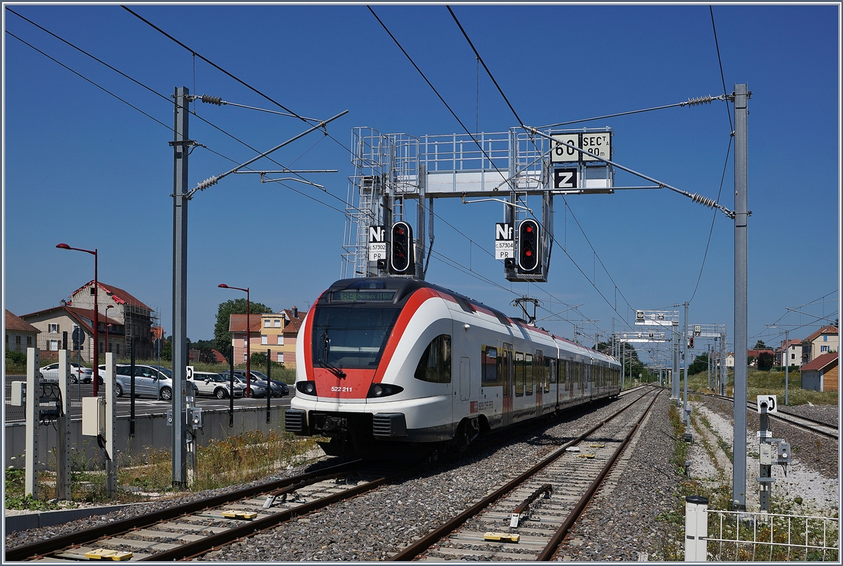 Der SBB RABe 522 209 erreicht den zur Wiederinbetriebnahme (ab 9.12.2018) der Strecke nach Belfort komplet neu gestalteten Bahnhof Delle.