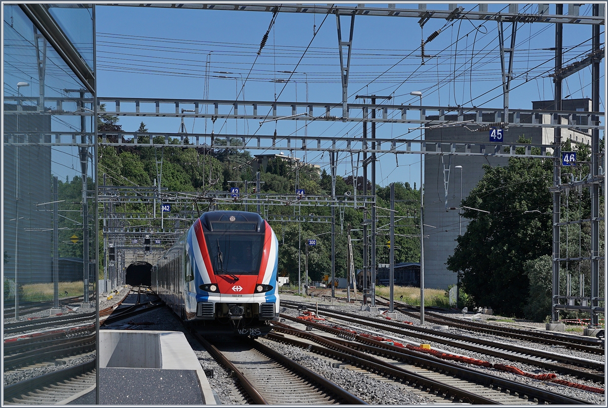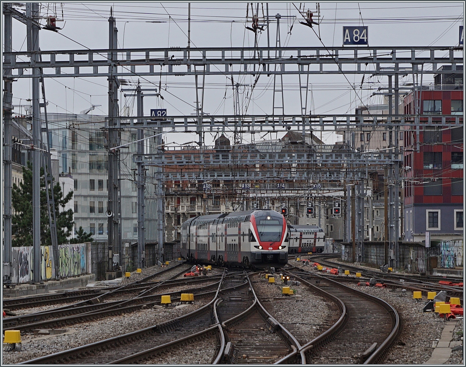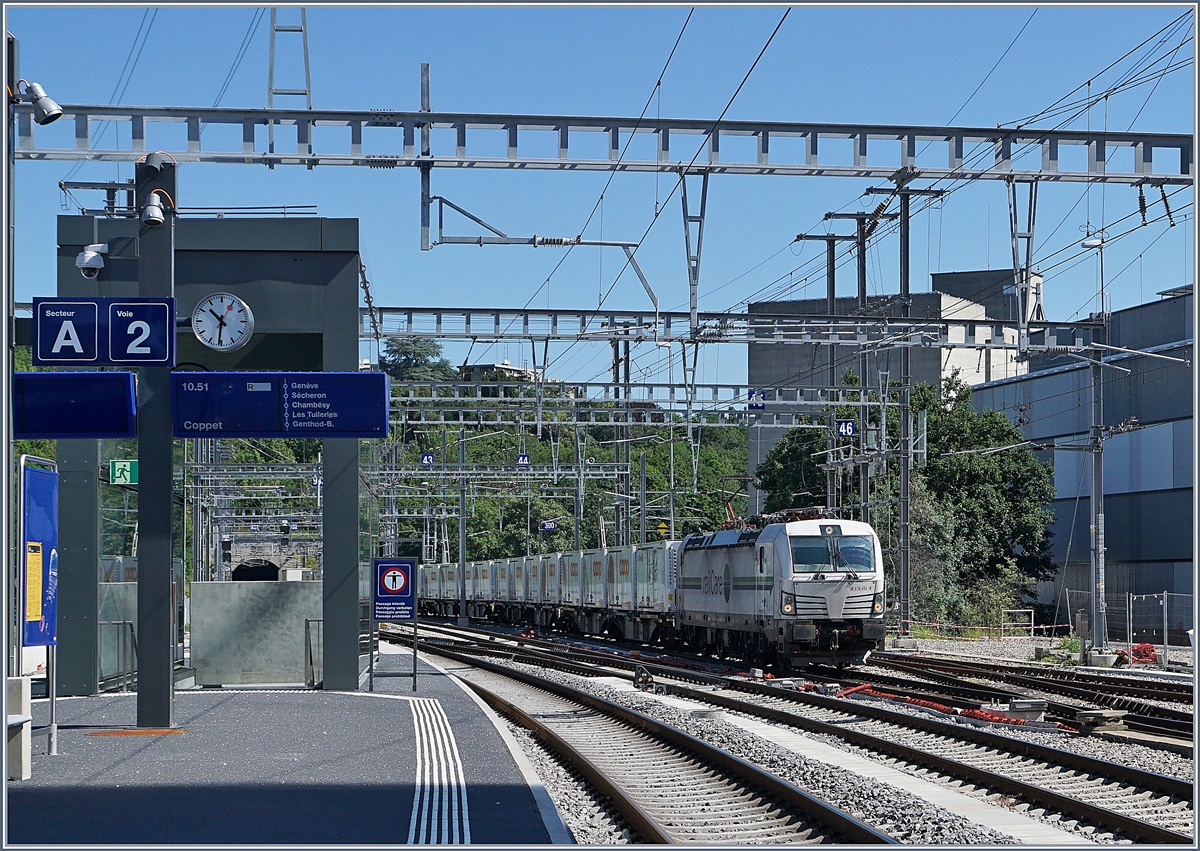 Ein Blick vom Lancy Pont Rouge in den Güterbahnhof Genève La Praille: Dort wartet die SNCF BB 26211 auf die Abfahrt Richtung Frankreich (via La Plaine).