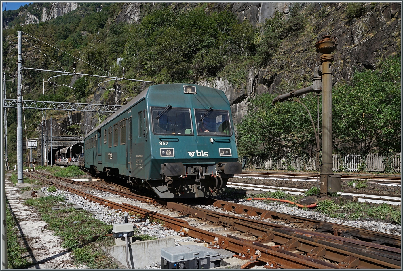 Von der (ehemaligen) Güterrampe in Iselle di Trasquera ein Blick auf den Bahnhof mit dem hier wendenden BLS RABe 528 102 (infolge SEV Iselle - Domo). Es war fotografisch gesehen von Vorteil, dass die Reisezüge auf Gleis 3 an- und abfuhren.