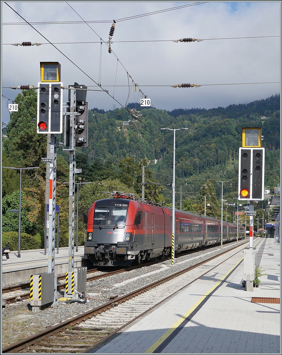 Die ÖBB 1116 222 rangiert mit ihrem RJ im Bahnhof von Bregenz und bietet mir so ein paar interessante Motive.