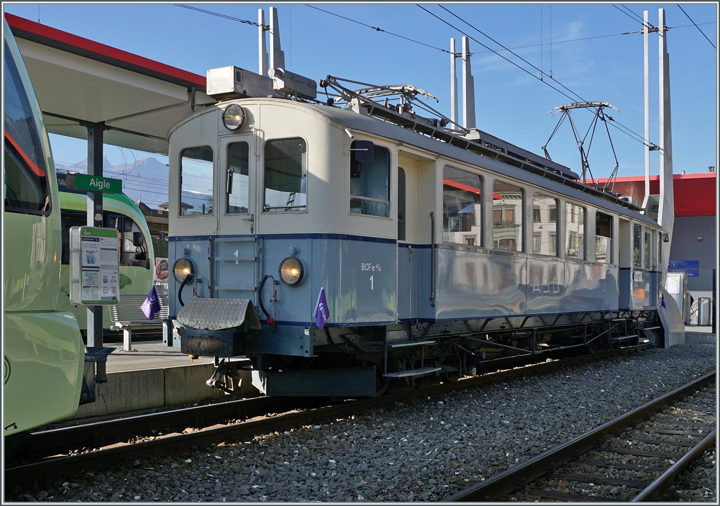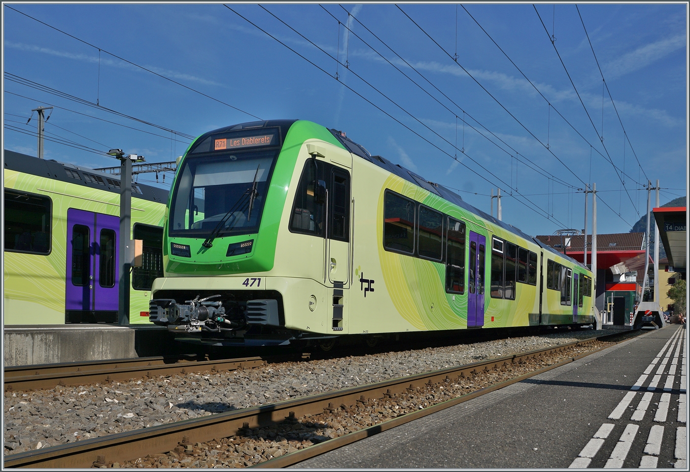 Aigle mit TPC Zügen nach Monthey, Les Diablerets und Leysin. Somit warten (von Links nach Rechts) der TPC Beh 2/6 541, der TPC ABe 4/8 471 und der BDeh 4/4 301 mit dem Bt 352 auf ihre Abfahrten.
