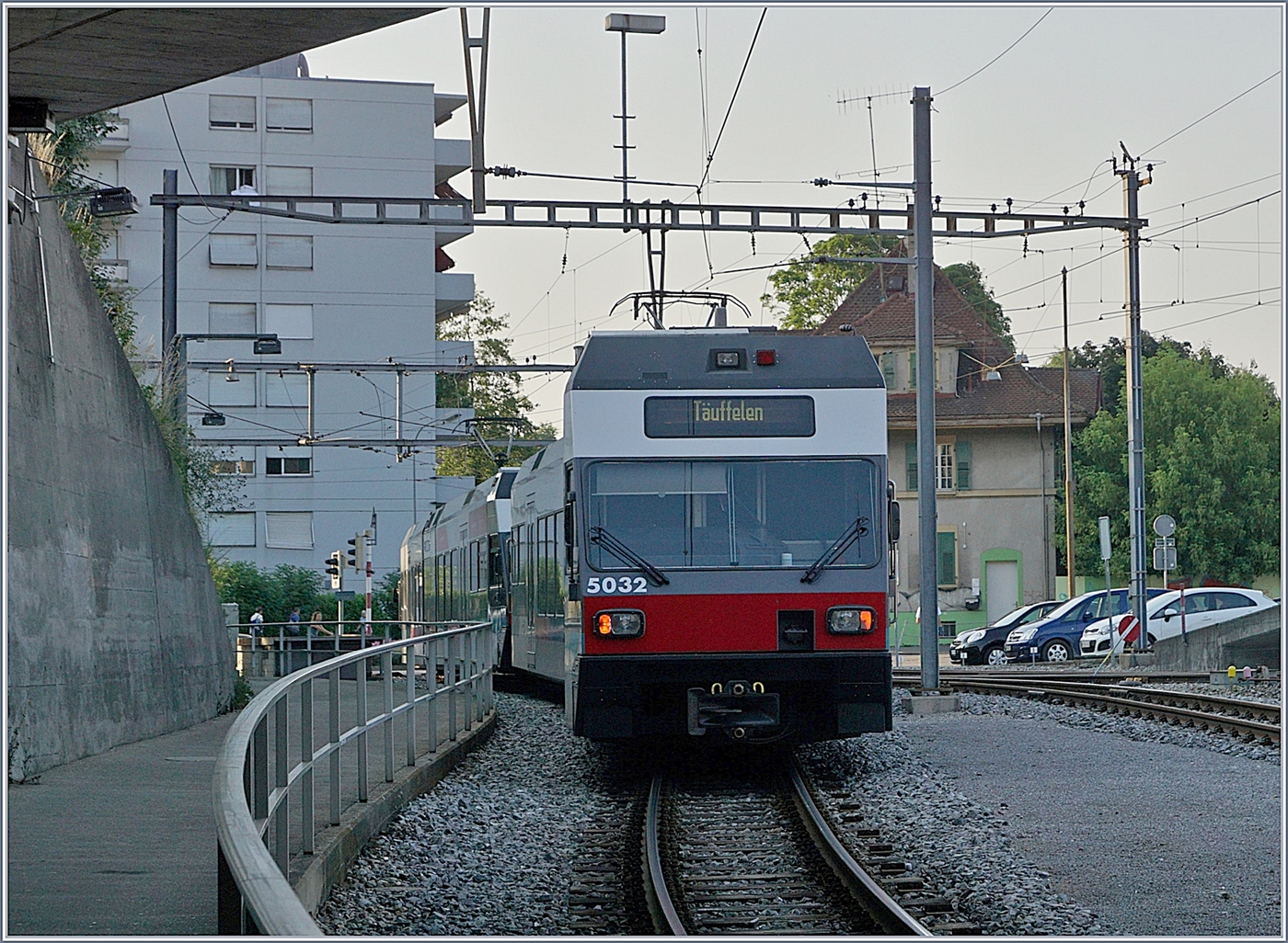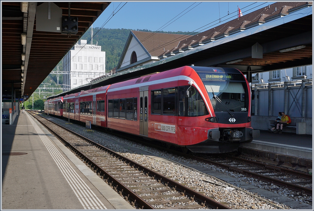 Zwei ASM GTW Be 2/6 erreichen von Tàuffelen her kommend ihr Ziel Biel/Bienne.
