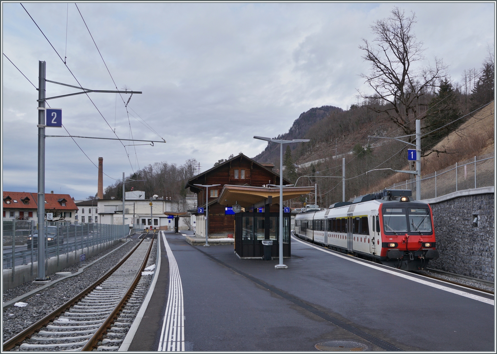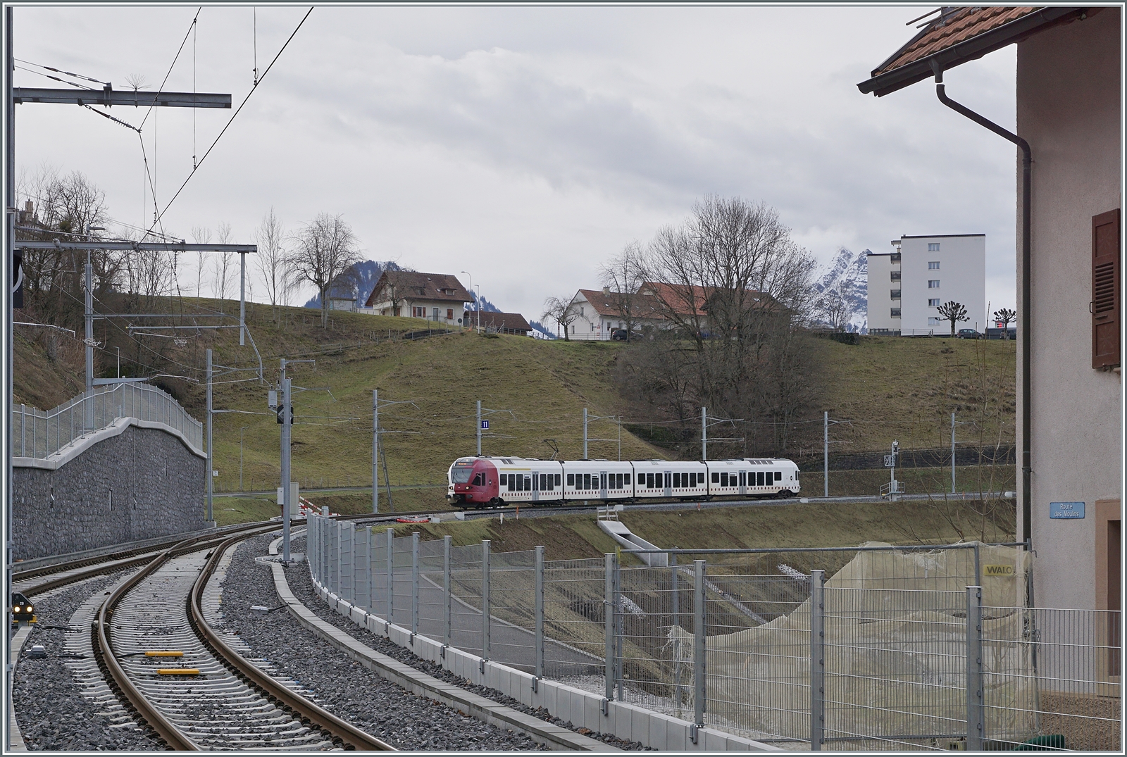 Während der gefällige TPF Flirt RABe 527 198 "Groupe Grisoni" in Bulle endet, fährt der SBB RBDe 560 weiter; wobei sich Bahnhofsanzeige und die Anzeige am Zug nicht ganz einig sind wohin die Fahrt geht. Kleine unstimmige Details in den ersten Tagen nach der Aufnahme des Verkehrs auf der umgespurten Strecken Bulle - Broc VILLAGE.