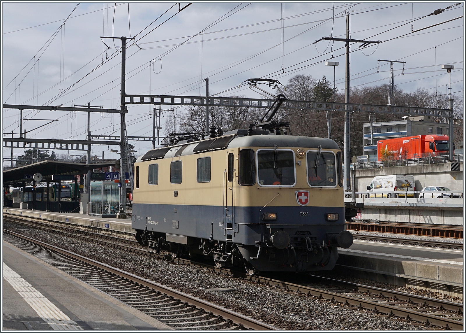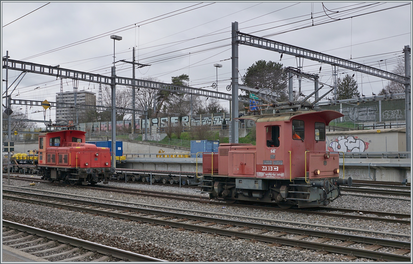 Die BAM MBC Re 4/4 II (UIC 91 85 4420 506 8 CH MBC) steht weiterhin vor ihrem leeren Zug, welchen sie aus Gland nach Morges gebacht hat.