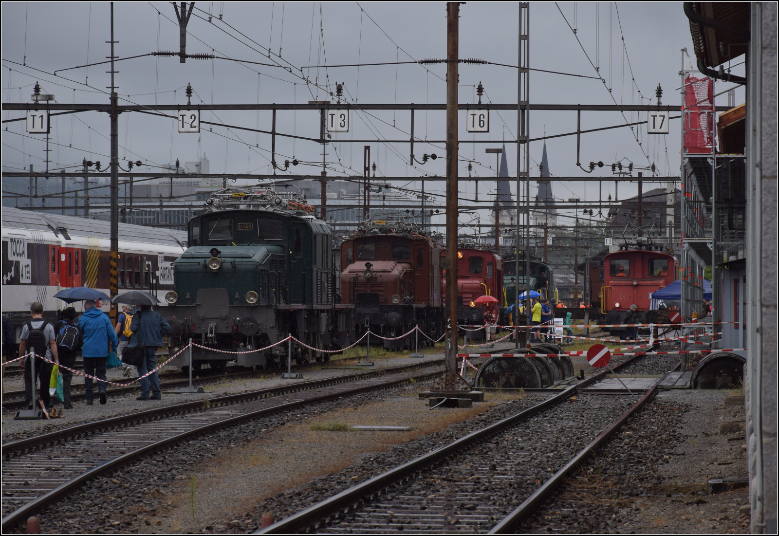 Der BCFZe 4/6 der BLS im funktionellen Design ist einer der Stars der Ausstellung. Er wurde im Jahr 1938 noch vor der Fusion an die Bern-Neuenburg-Bahn geliefert. Die verschiedenen Baustile hier am Bahnhof Olten werden gerade noch vom Bauhaus-Stil ergänzt. August 2023.