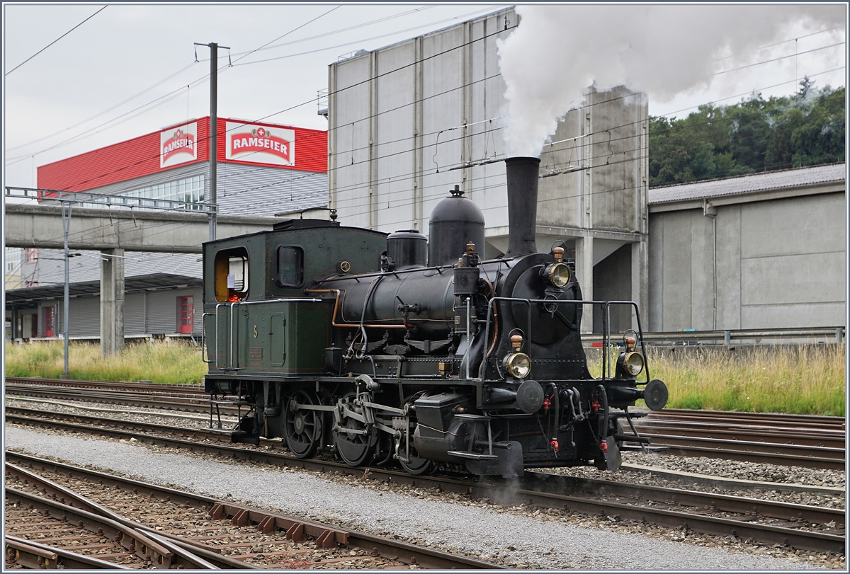 Die kleine ST Dampflok E 3/3 N° 5 auf grosser (Rangeier)-Fahrt in Sursee: Um ihren von Triengen nach Sursee gebrachten Zug wieder nach Triengen zurückzuziehen muss der Wagenpark auf der Gleisanlage südlich des Personenbahnhofs von Sursee umfahren werden.