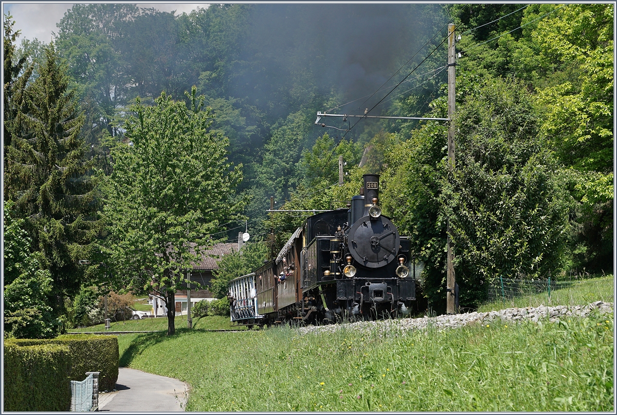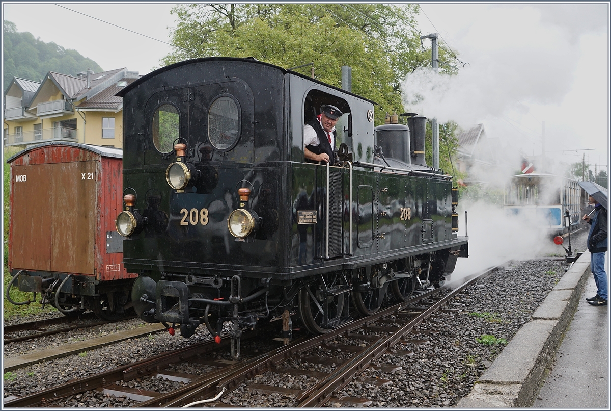 50 Jahre Blonay - Chamby Museumsbahn: die die SEG G 2x 2/2 105 und HGe 3/4 N° 3 verlassen Blonay mit dem offiziellen Eröffnungszug mit geladen Gästen zur 50 Jahre Feier der Museumsbahn.