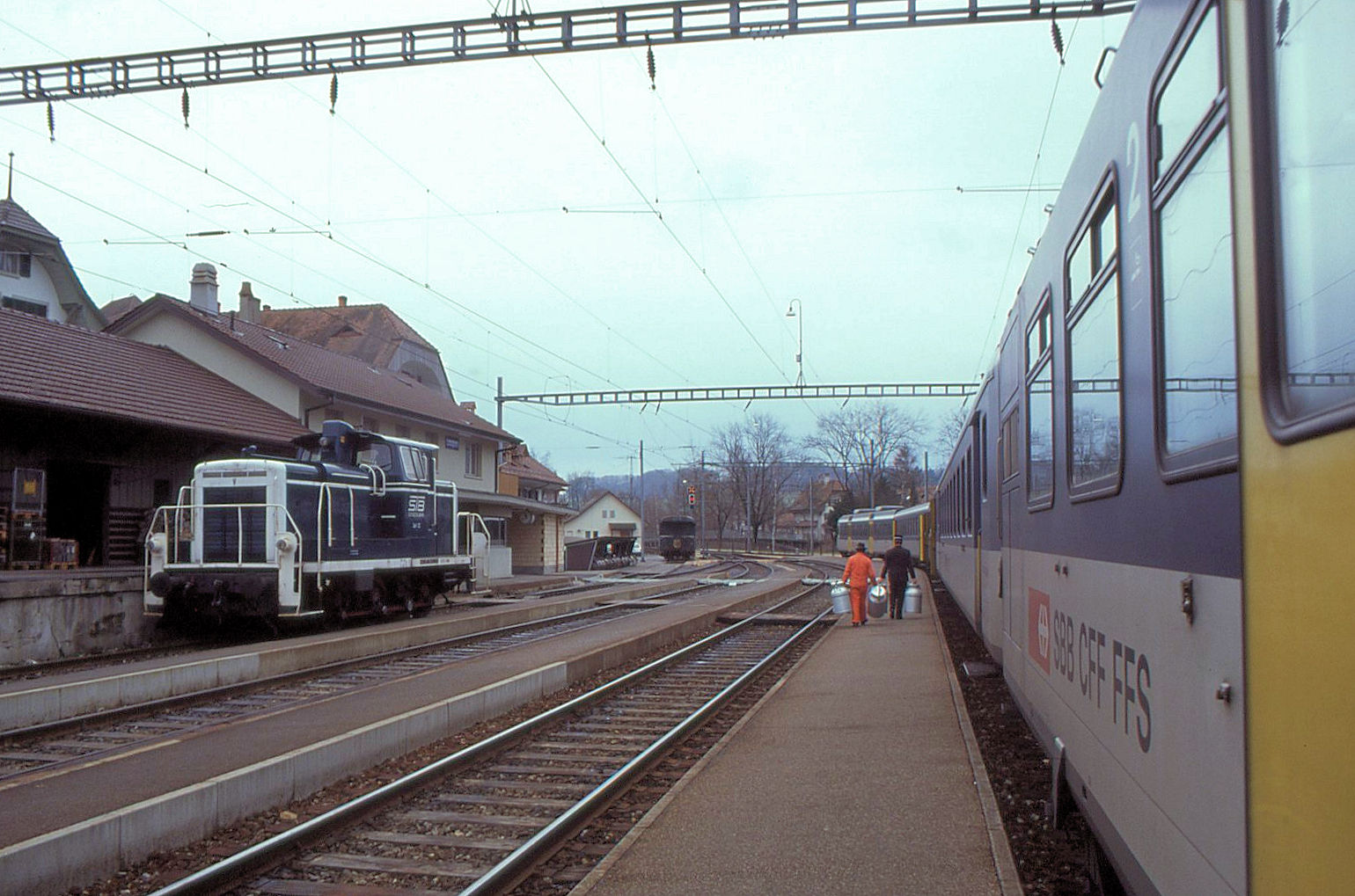 Während im zuvor eingestellten ähnlichen Bild in der Station Laupen der Zugchef des SBB NPZ 2180 Milchkannen herumträgt, erscheint jetzt noch ein oranger Mann mit weiteren Milchkannen... Daneben die ehemals deutsche Em3/3 12 der Sensetalbahn. 4.Januar 1991