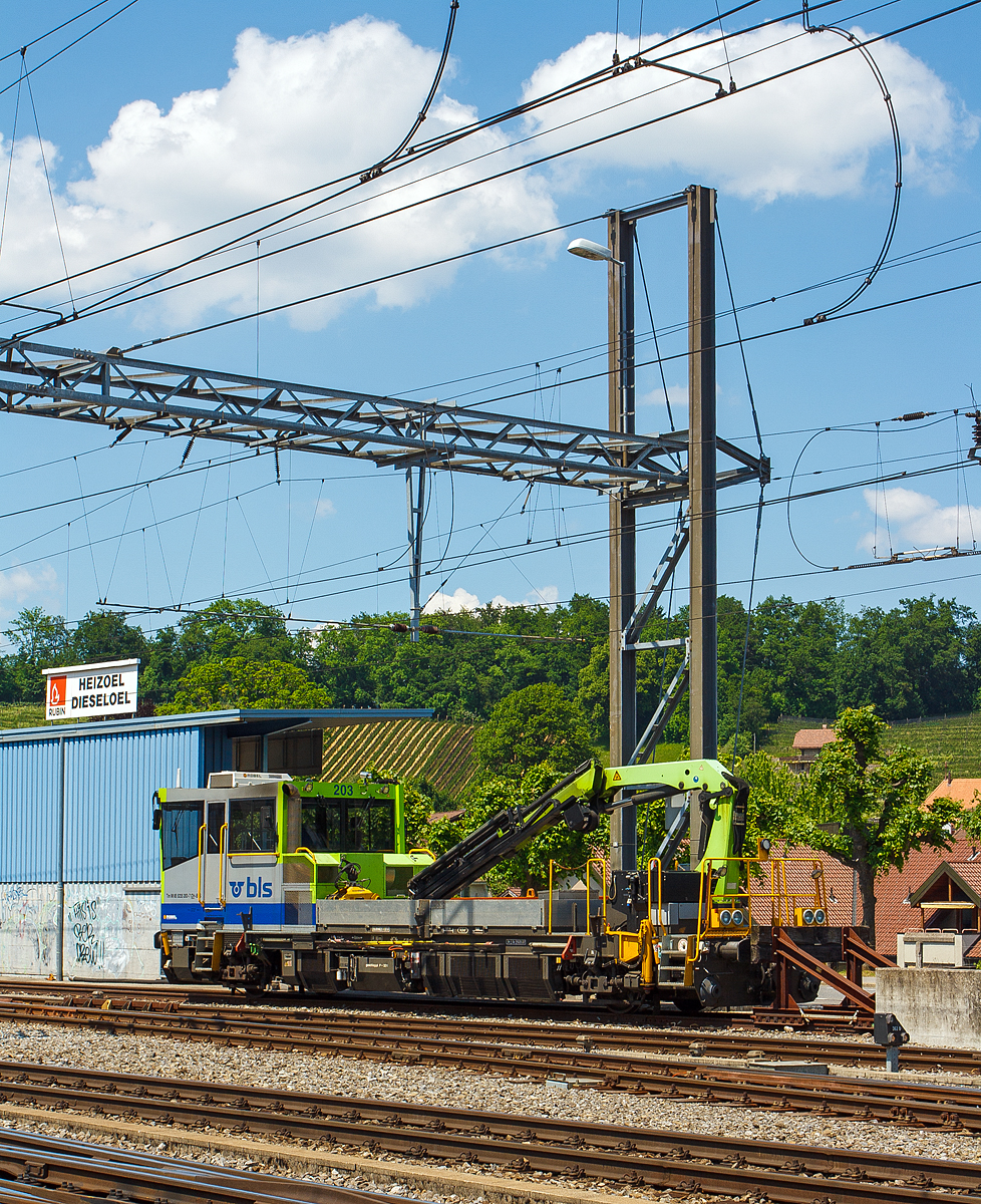 Der BLS Bautraktor Tm 235 203-7 (Tm 98 85 5235 203-7 CH-BLS), ein BLS SIF (Störungsinterventionsfahrzeuge) Typ C bzw. Robel Gleiskraftwagen mit PALFINGER-Kran PK 20002 D 20mt (Baujahr 2007), abgestellt am 28.05.2012 beim Bahnhof Spiez. BLS Anforderungen an die Störungsinterventionsfahrzeuge im Einsatz sind u.a.: Modernstes Partikelfiltersystem für problemlosen Einsatz speziell im Tunnelbereich. Funkfernsteuerung für den Baustelleneinsatz inkl. Kranbedienung (V = 0 bis10 km/h), z. B. für Verfüllarbeiten von Schotter. Transport von Baumaterial und Geräten zur Baustelle. Schienenladeeinrichtung für den Transport von zwei 13 m-Schienen. Leistungsfähiger Ladekran mit großer Reichweite, je nach Typ teilweise ausgerüstet mit Arbeitskorb für die Instandhaltung der Oberleitung. Große Kabine mit Standheizung und Temperatur-Absenkanlage, Sitzplätze für 7 Personen (1 Fahrer, 6 Beifahrer). TECHNISCHE DATEN: Spurweite: 1.435 mm Achsfolge: B Länge über Puffer: 14.396 mm Achsabstand: 9.000 mm Treibraddurchmesser: 920 mm (neu) Gesamtbreite: ca. 3.160 mm Länge der Ladefläche: 5.500 x 2.700 mm Eigengewicht: 32 t Zuladung: 5 t Minimaler Kurvenradius: R 80 m Höchstgeschwindigkeit (hydrodynamisch): 100 km/h Höchstgeschwindigkeit (hydrostatisch): 10 km/h Höchstgeschwindigkeit (geschleppt): 100 km/h Motorart und -type: 2 Stück wassergekühlter V6-Zylinder-Dieselmotor mit Turboaufladung, Ladeluftkühlung und Vierventiltechnik vom Typ DEUTZ TCD 2015 V6 4V Hubvolumen je Motor: 11,9 l (Bohrung Ø 132 mm x Hub 145 mm) Leistung (an der Welle): 2 × 330 kW = 660 kW Nenndrehzahl: 2.100 U/min (min Leerlaufdrehzahl 600 U/ min) Motorgewicht (trocken): 1.020 kg Abgas-Emissionswerte: gemäß RL 97/68/EG Stufe IIIA Antriebsart: Diesel – Hydrodynamisch Turbogetriebe: 2 x VOITH T211 Anfahrzugkraft: 100 kN Max. Anhängelast: 2.600 t Bremse: IE-GP-hd mZ, Fs, Dynamische Bremse (Retarder VOITH) Stromerzeuger für externe Verbraucher: 13 kVA, 400 V Sicherheitseinrichtungen: SIGNUM Integra / Reichweite vom Kran (PK 20002D) bis 14,7 m (Tragkraft 910 kg), bei 4,3 m Ausladung liebt die Tragkraft bei 4.000 kg.