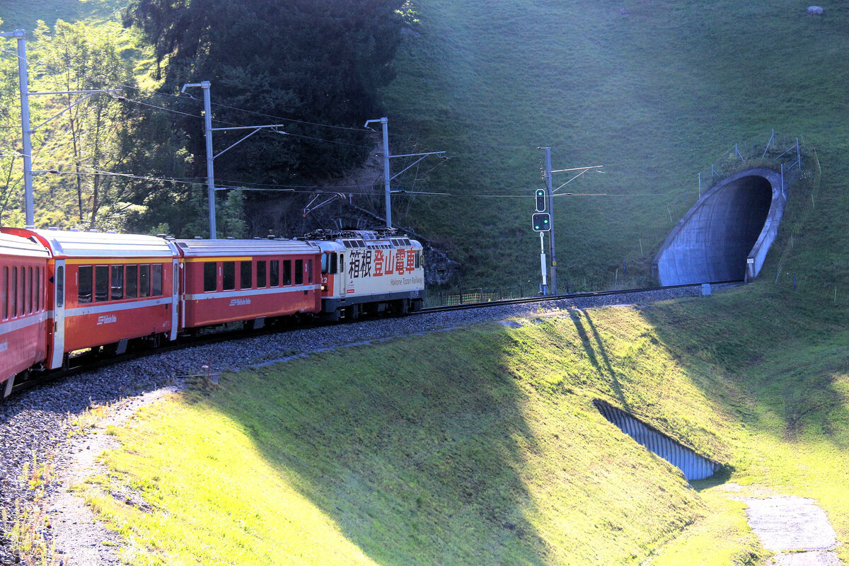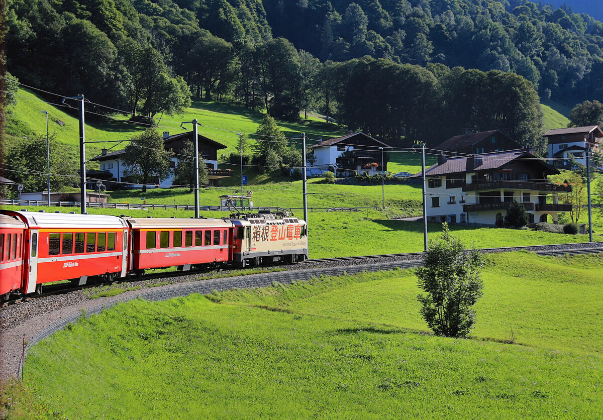 RhB Ge 4/4 II mit RE nach St.Moritz (links) und Davos (rechts) in Filisur.