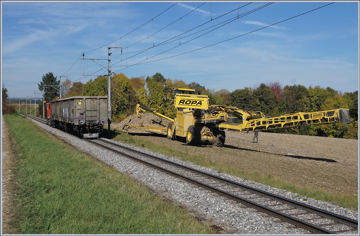 Die BAM MBC Ge 4/4 22 ist mit fünf Eaos zwischen Reverolle und Chardoney-Château angekommen und wartet auf die Verladung der Zuckerrüben, was noch etwas dauert, ist doch der mit diesem Zug angekommener Tm 2/2 41 mit zwei Eaos noch zur vorher liegenden Verladestelle zurückgefahren und dort die noch verblieben Rüben aufzuladen.