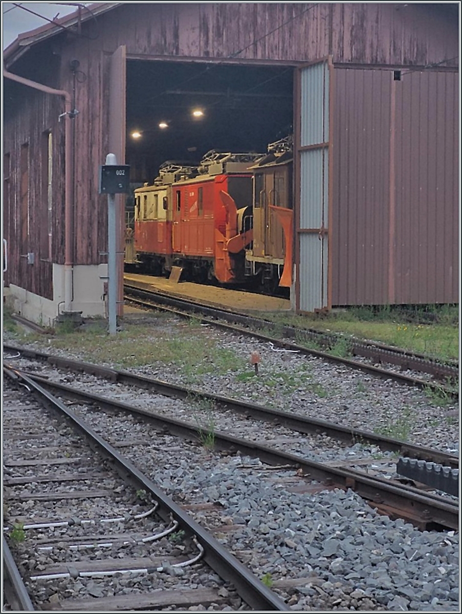 Ein Blick auf den WAB Güterumschlagplatz von Lauterbrunnen mit dem WAB BDeh 4/4 115 beim Güterschuppen und des etwas verdeckten He 2/2 32.