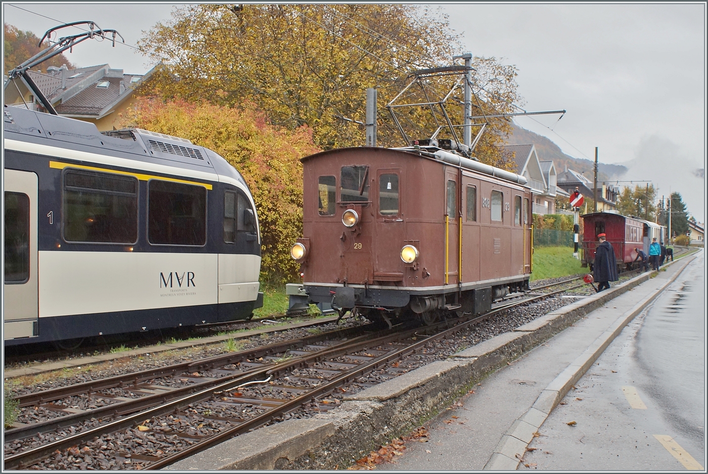 Die BOB HGe 3/3 29 der Blonay-Chamby Bahn bei Vers-chez-Robert auf der Fahrt nach Blonay.