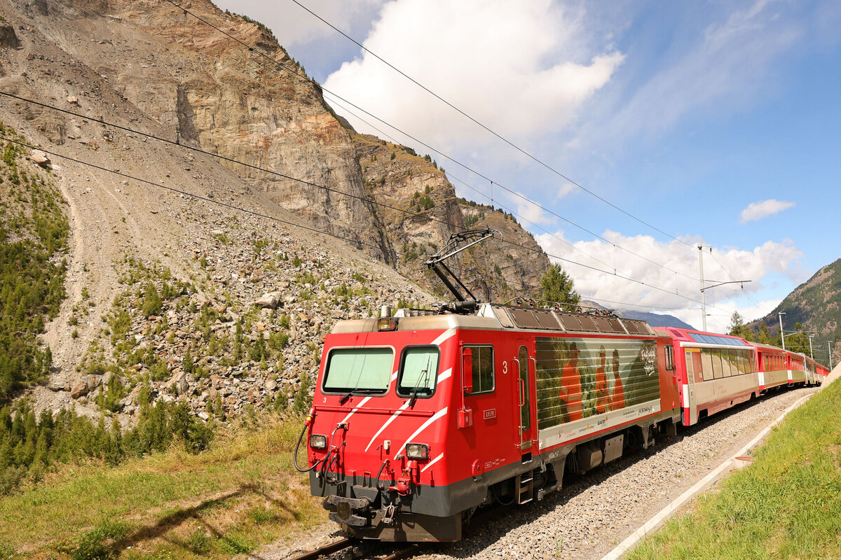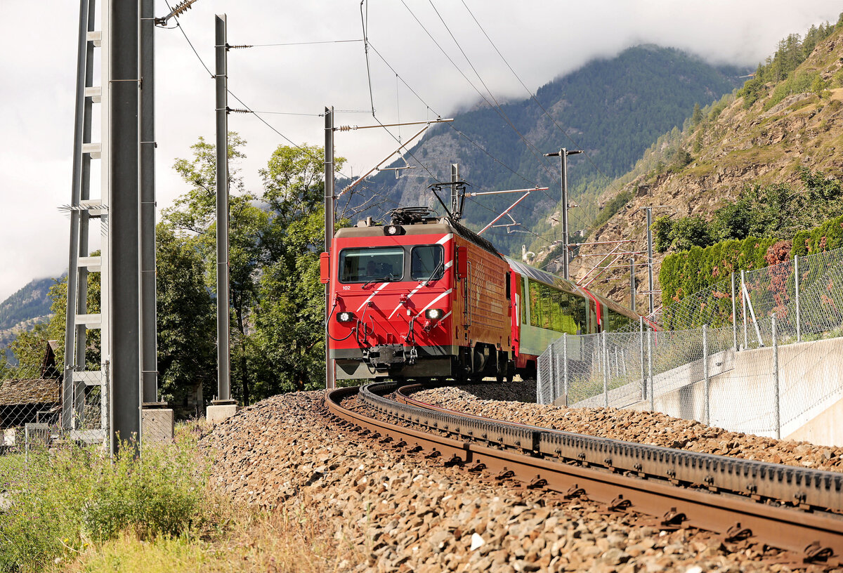 Die MGB HGe 4/4 103 mit einem Regionalzug nach Disentis im zur Zeit durch Umbauarabeiten etwas eingeschränkt zu benutzenden Bahnhofs von Andermattt .
