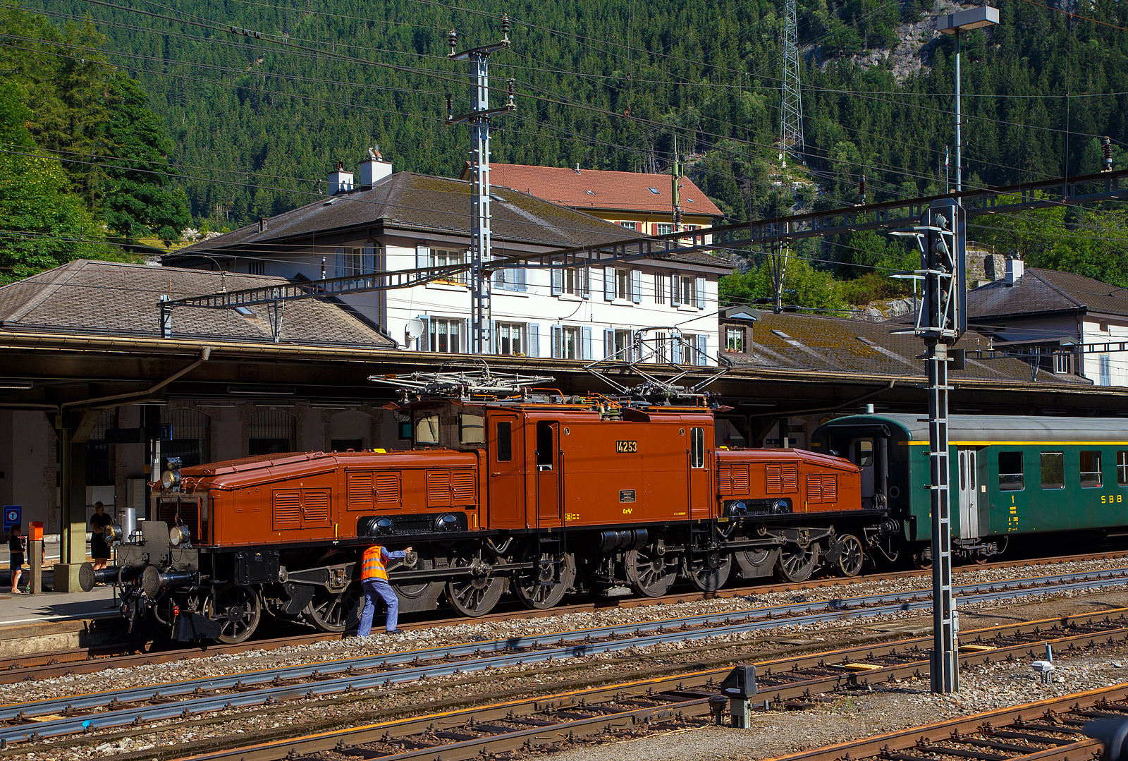 Die Ce 6/8 II 14253 in Domodossola im Rahmen eine Extrafahrt. Der Herr ganz rechts im Bild ist nicht etwa so etwas wie ein Fotograf, sondern er wird die Krokodillok an den Zug (knapp ausserhalb des Bildrandes) kuppeln.