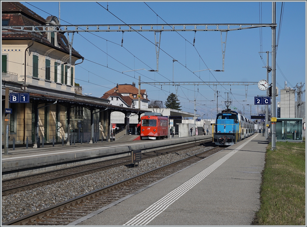 Während rechts im Bild der Stadler Eea 936 133-8 mit einem sechsteiligen Westbahn "Kiss 2" auf dem Weg in Richtung St. Margrethen in Rheineck durchfährt, wartet links im Bild der der AB RhW BDeh 1/2 auf die Abfahrt nach Walzenhausen. 23. März 2021