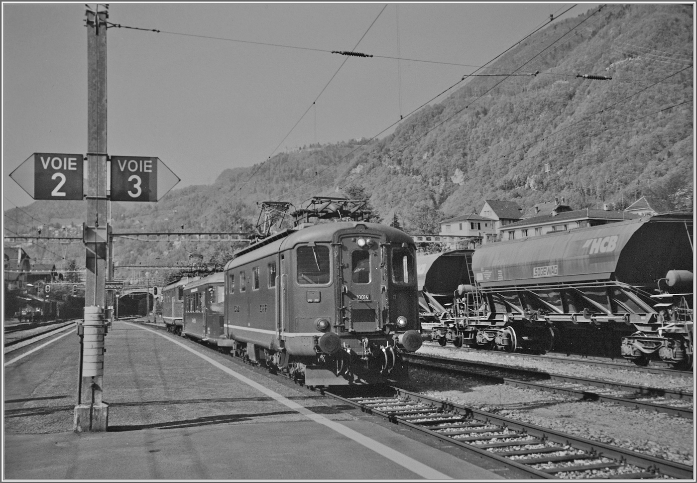 Als S/W Version: Die Re 4/4 I 10039 stellt den Extrazug 31131 in Lausanne bereit. Der Zug verkehrt für eine Reisegruppe nach Zürich Enge (mit Halt in Palézieux). Der Zug besteht aus dem "Le Salon Bleu" 61 85 80-90 200-6 CH-IRSI, dem 56 80 89-80 010-2 WGm D-IRSI und dem Am 56 80 10-40 360-4 D-IRSI. Da der TEE Rheingold Genève - Amsterdam am Schluss seiner Einsatzzeit vor vielen Jahren aus einem DB Speisewagen, einem DB Abteilwagen und einen DB Großraumwagen bestand und auch von einer Re 4/4 I gezogen wurde, weckt der heutige Zug doch Erinnerungen an den TEE 6 / 7, der am 23. Mai 1982 zum letzten Mal ab Genève fuhr, (und sich dann noch gut zwei Jahre auf dem Abschnitt Basel - Amsterdam hielt). Leider die Re 4/4 I 10039 etwas ungeschickt vor dem Schild "Überschreiten der Geleise verboten, und leider waren diese Lichtverhältnisse nichts für meine kleine Knipse, so dass ich hier ausnahmsweise ein Handy-Bild zeige. 11. Dezember 2024