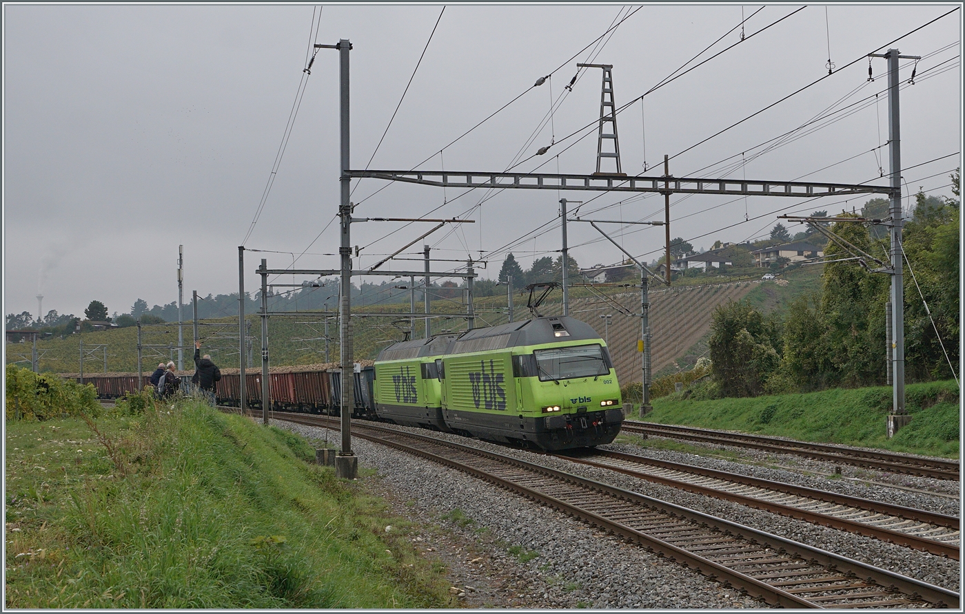 Mit der BLS Re 465 003 an der Spitze, einer Vectron an zweiter Stelle und einer BLS Re 465 als Schiebelok (hier nicht zu sehen) fährt ein Güterzug durch Preglia in Richtung Brig.