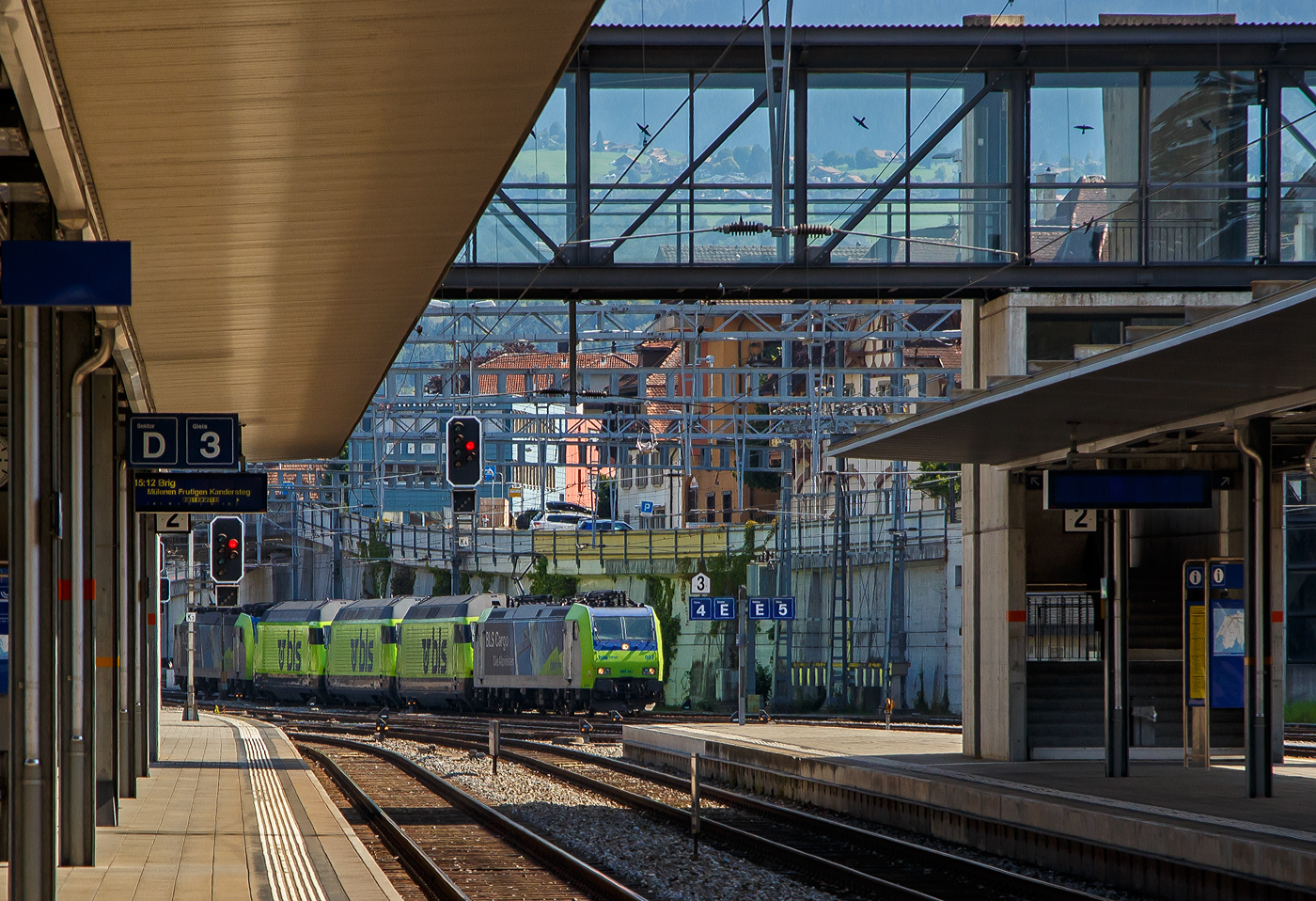 Zwei BLS Re 485 mit einer RoLa von Freiburg i.B. nach Novara bei der langsamen Durchfahrt (Spurwechsel) in Preglia.
