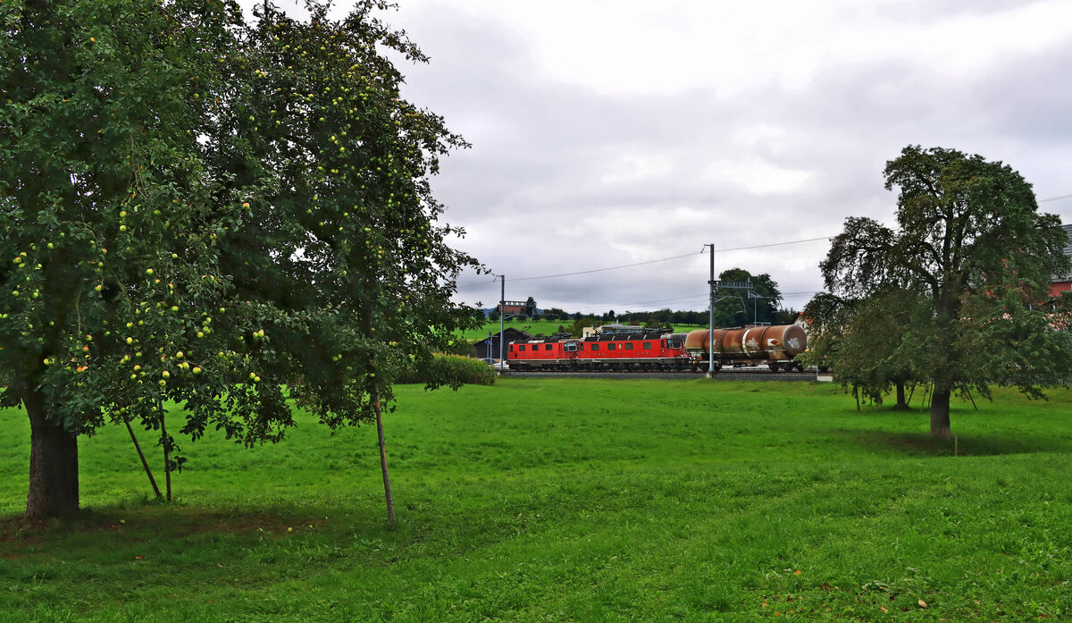 An der ehemaligen BT-Strecke Romanshorn - St.Gallen: Ein schwerer Tankwagenzug wird von den beiden Loks Re 4/4 11242 und Re 6/6 11670 über den Berg nach St.Gallen geschleppt. Muolen, 7.Oktober 2021