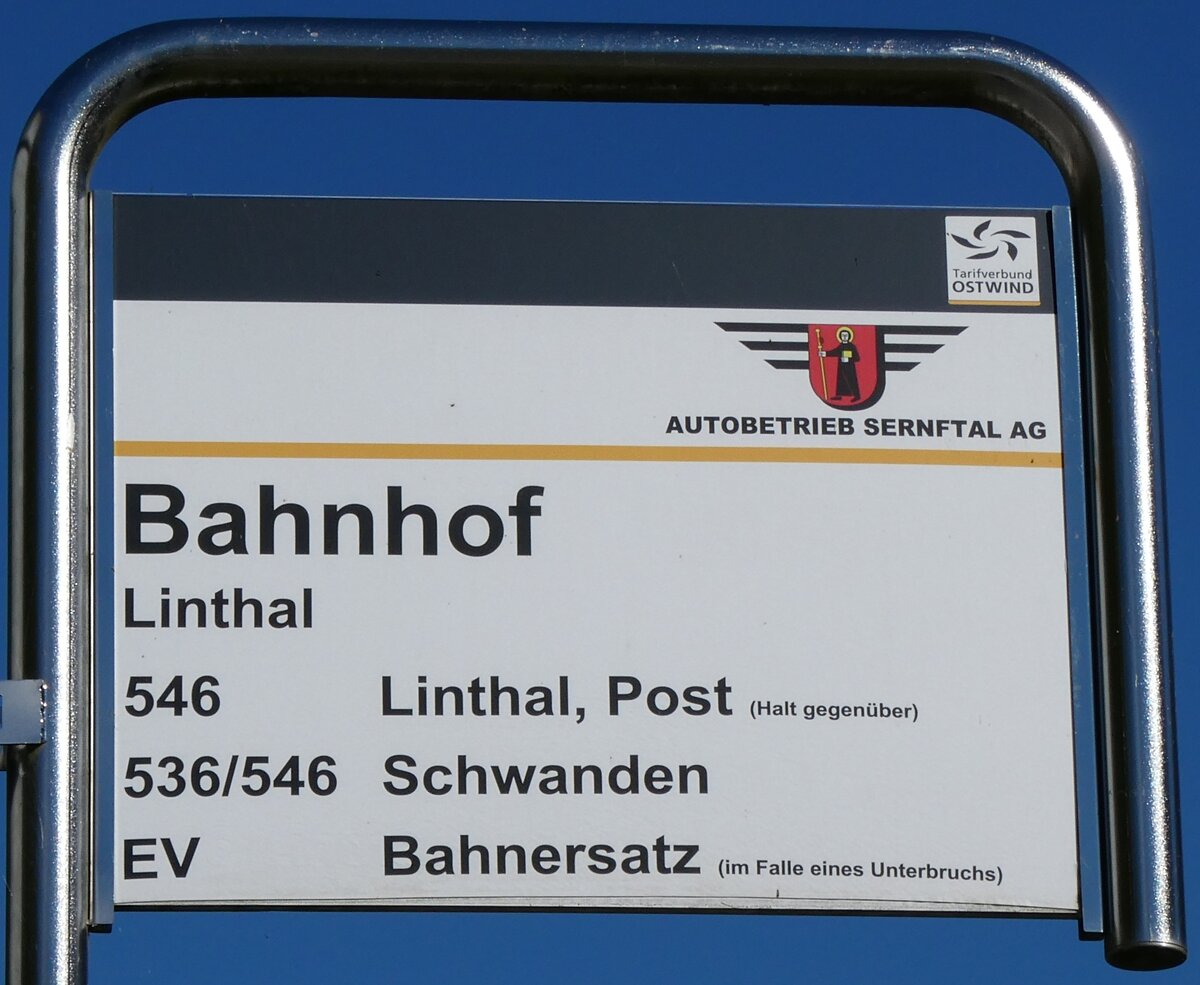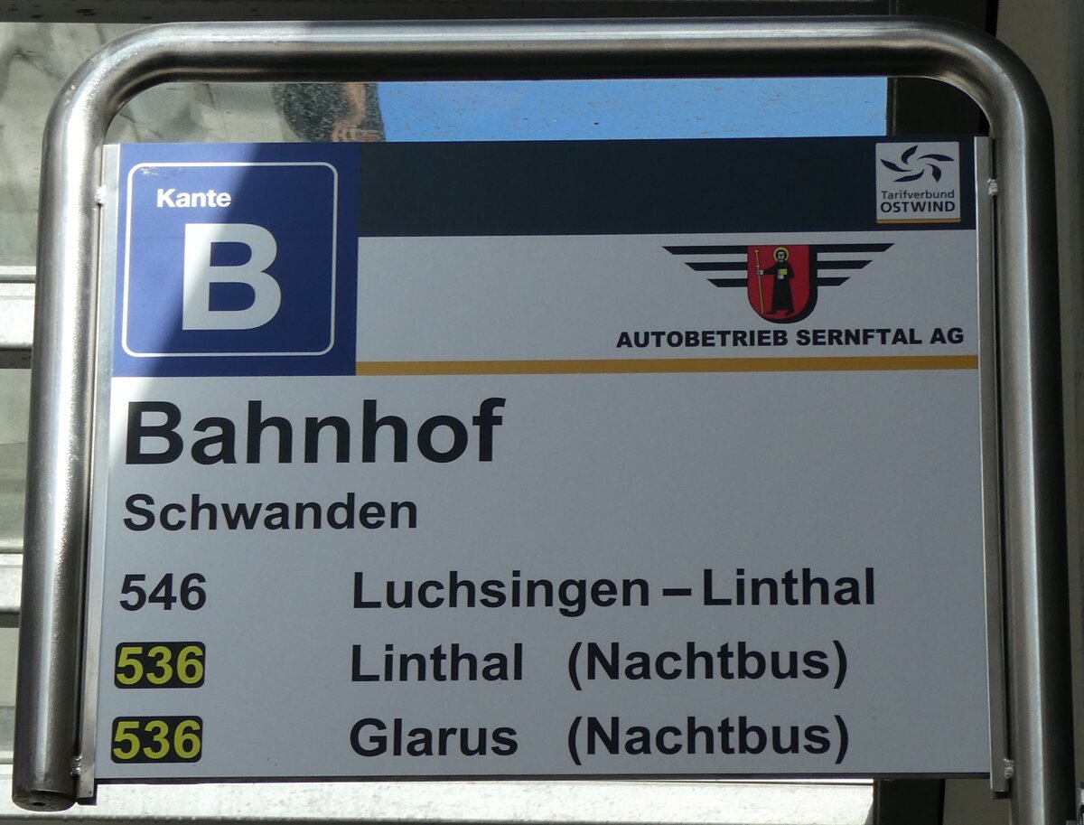 (281'057) - AUTOBETRIEB SERNFTAL-Haltestellenschild - Schwanden, Bahnhof - am 7. Oktober 2025