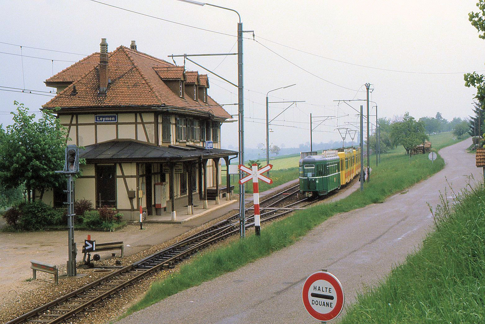 Im Anschluss an Stefans schöne Bilder der französischen Station Leymen hier noch eine ältere Aufnahme: "Halte, Douane" - Grenze! Ein Tramzug der damaligen Linie 17 mit BLT Be4/6 257 und 237 und dem BVB-Anhänger 1422. 18.Mai 1985 Peter Ackermann