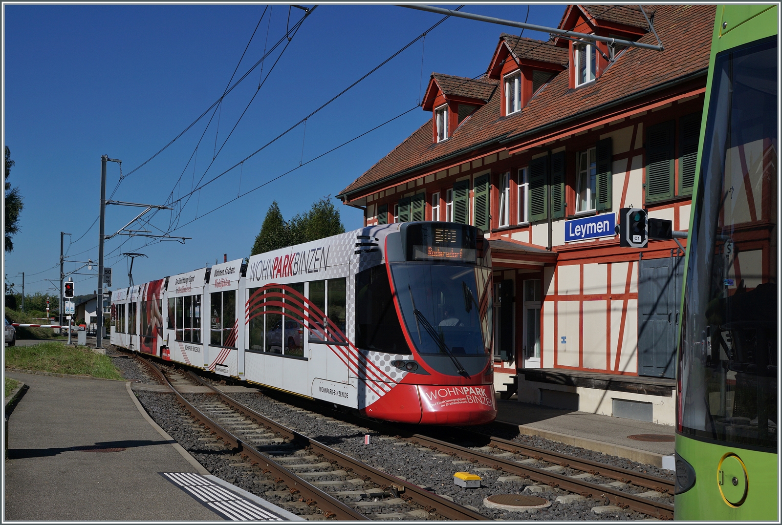 ein wunderschönes Bild aus Leymen! Interessant ist natürlich das "Halte Douane" - Schild rechts im Bild. Ich könnte mir vorstellen, dass dei Strasse in Richtung Burg Landskron in der Folge in die Schweiz führte und der Zoll bereits in der Nähe von Leymen angesiedelt war. (Siehe auf Kommentar zu Bild ID 826203).Heute stehen rechts im Bild bzw. Bildrad etliche Einfamilienhäuser und auch vom Tal her hat die Bebauung den Bahnhof erreicht.