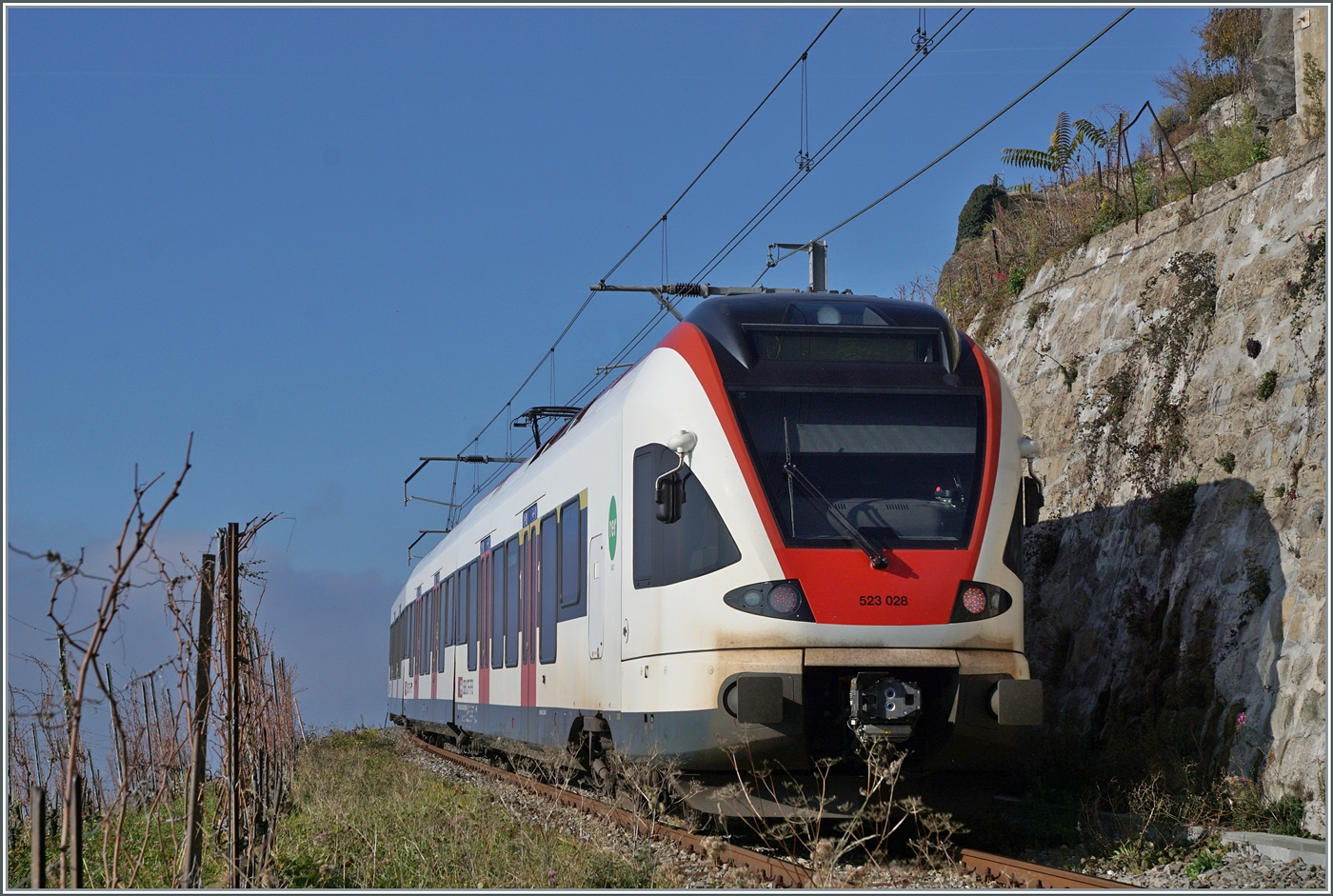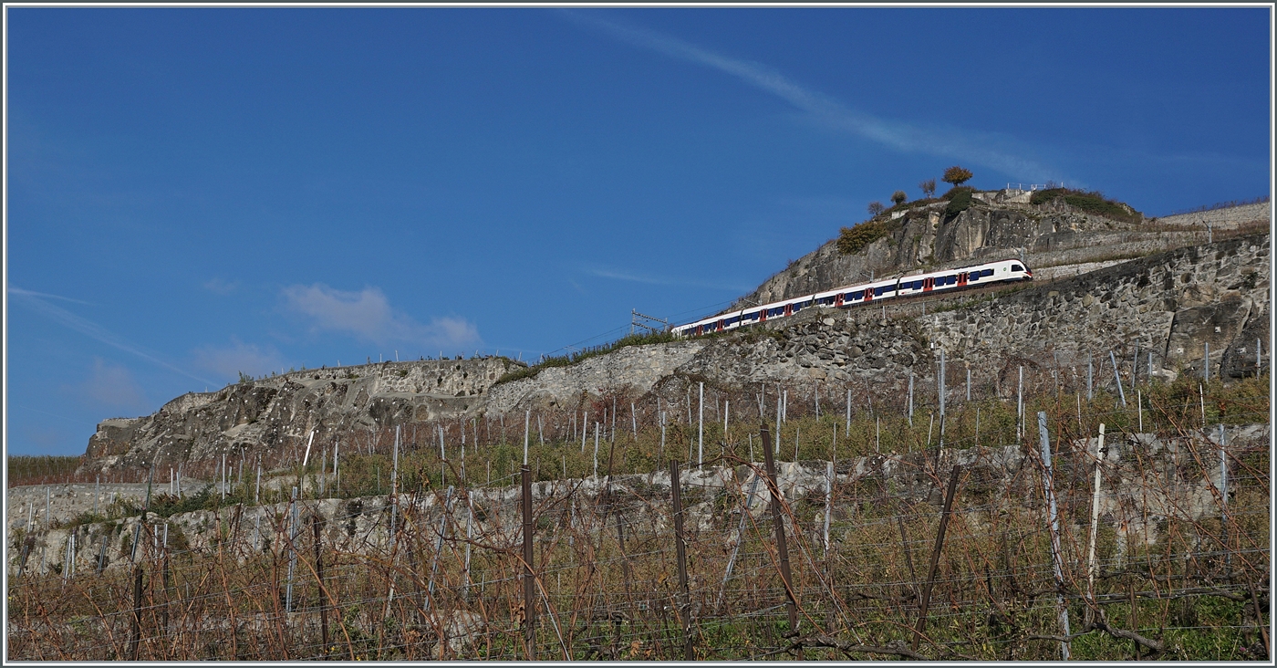 Der RBDe 560 131 "Train de Vignes" ist auf seiner Strecke hoch über dem Genfersee unterwegs.