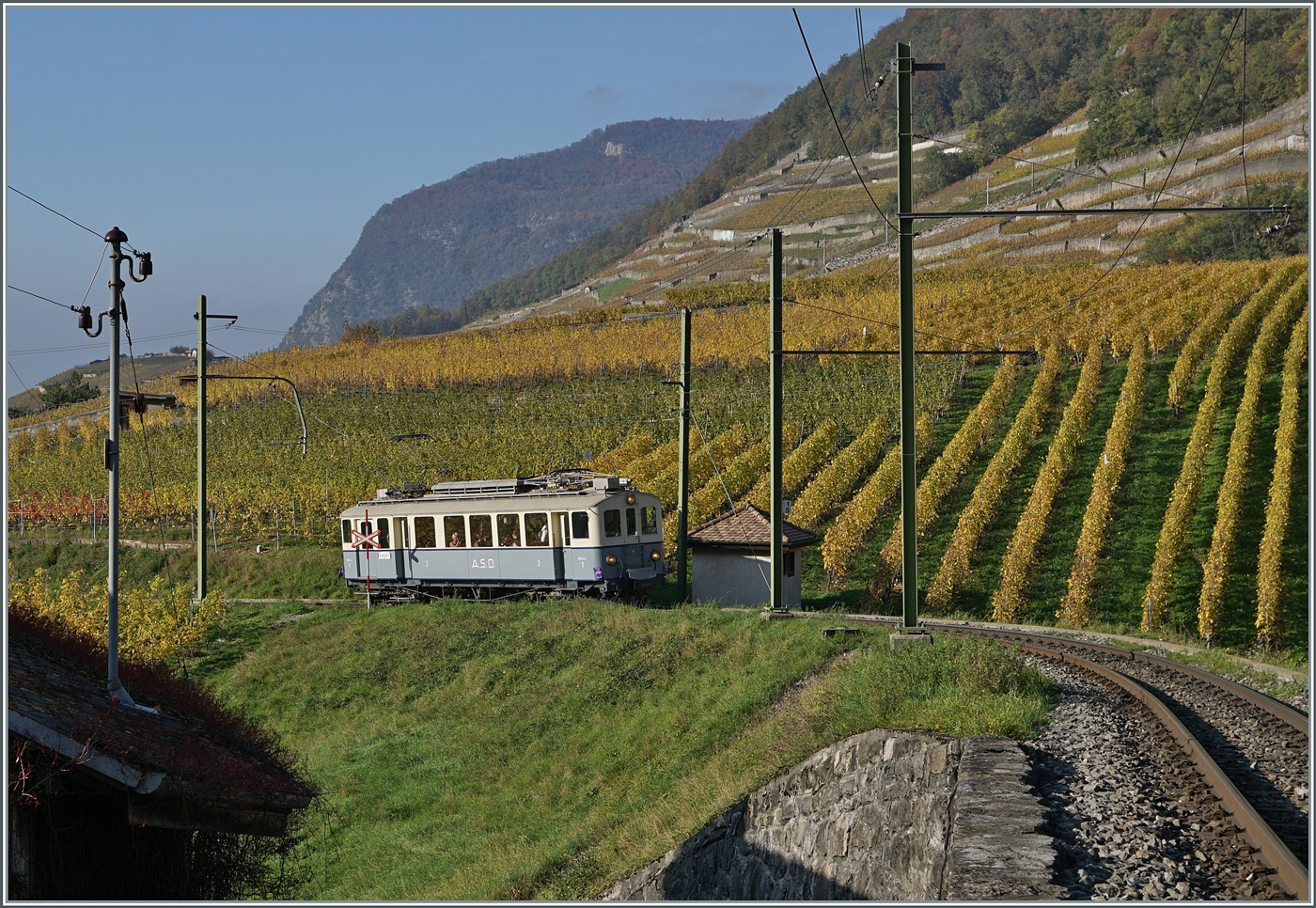 Der ASD BCFe 4/4 N° 1 und der BDe 4/4 N° 2 mit einem Extrazug nach Aigle, kurz nach Le Sépey.