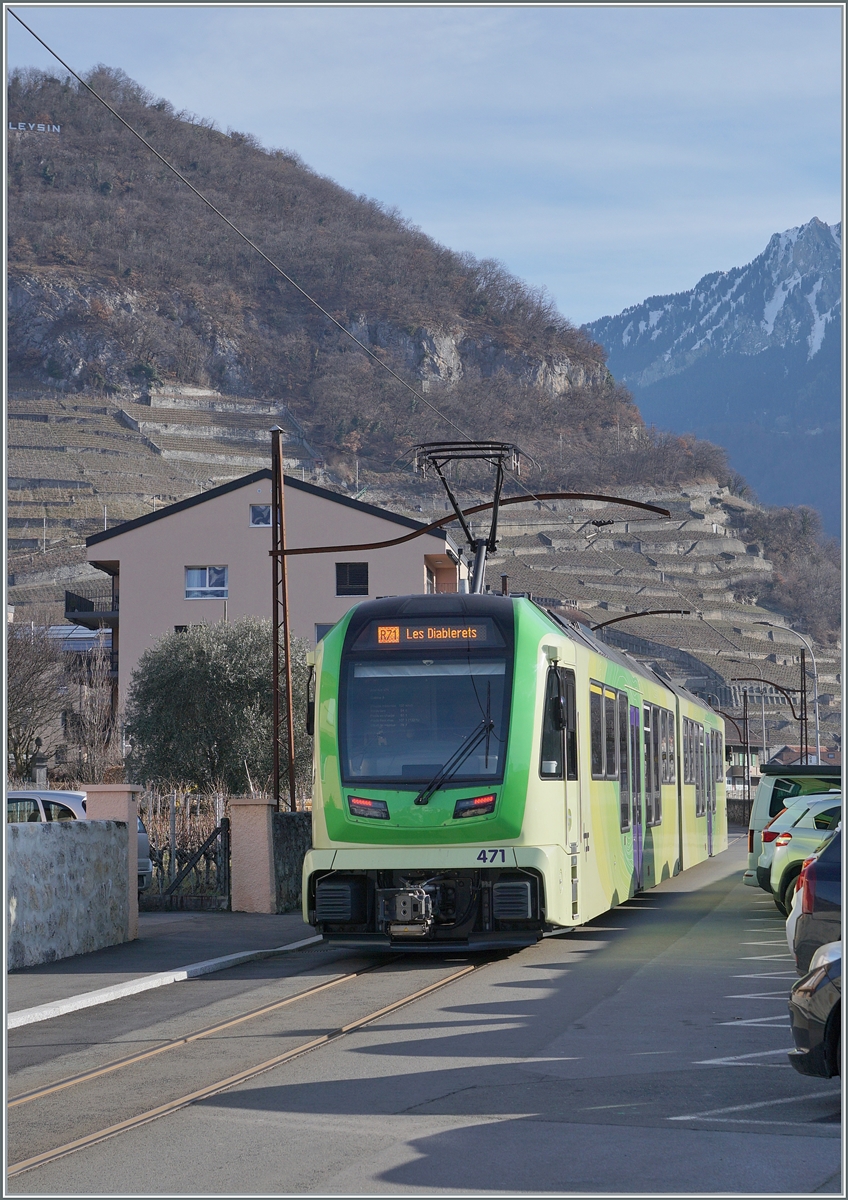 Der TPC ASD ABe 4/8 473 ist als R71 von Les Diablerets nach Aigle unterwegs und hält kurz in Aigle Place du Marché. Die Haltestelle ist nun mit einem Bahnsteig versehen worden und befindet sich gut 50 Meter nördlicher der "alten" Haltestelle. Zudem wurden wie bereits erwähnt neue, den alten sehr gut nachempfundene Fahrleitungsmasten aufgestellt. 9. Februar 2026