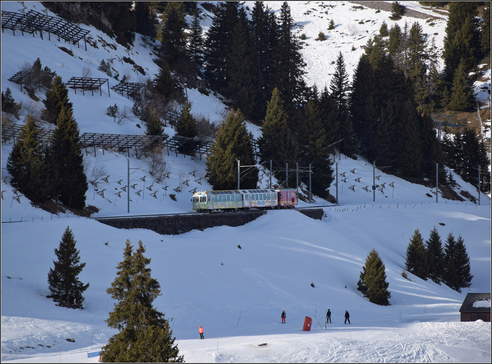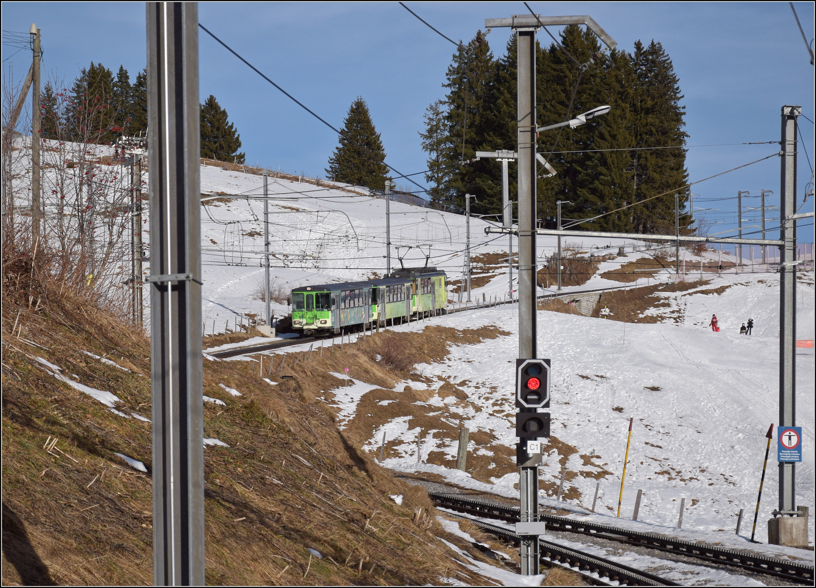Der TPC BVB BDeh 4/4 81 in der Station Roches-Grises. Ab hier verläuft die Strecke bis in den Bahnhof von Villars sur Ollon doppelspurig.