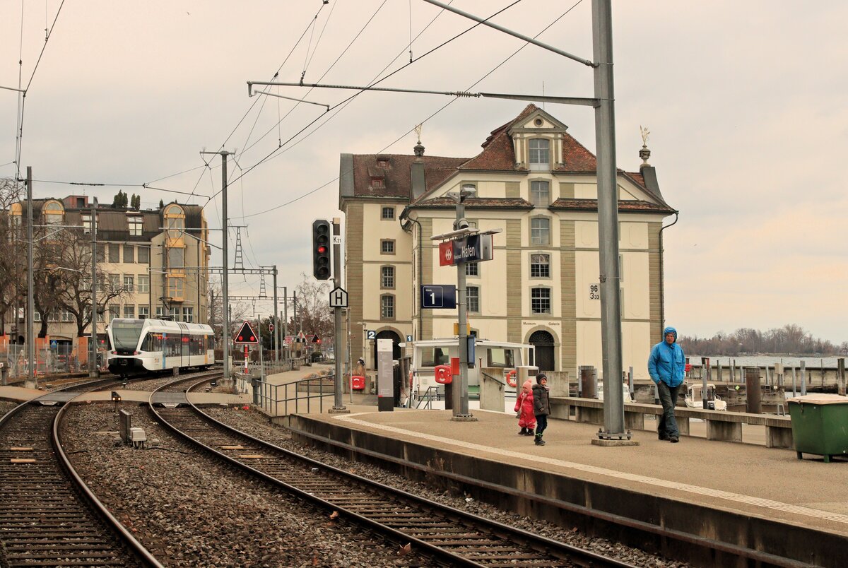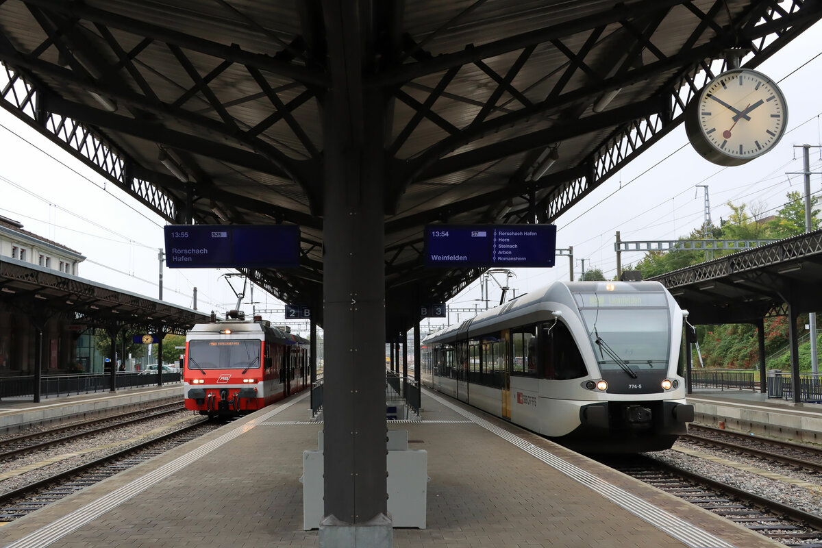 Seelinie Rorschach - Arbon - Romanshorn - Kreuzlingen (dann Fortsetzung Stein am Rhein - Schaffhausen) : Diese SBB-Linie wurde ab 1996 durch die Mittelthurgau Bahn betrieben, und nach deren Konkurs 2002 durch die Thurbo. Zwischen Rorschach und Kreuzlingen ist die Strecke getrennt, einerseitrs Rorschach - Romanshorn (Strecke 845) als St.Galler S7 Rorschach - Romanshorn - Weinfelden, andererseits (Strecke 820) als St.Galler S8 (St.Gallen - ) Romanshorn - Kreuzlingen - Schaffhausen; dazu kommt der Regional Express (Konstanz -) Kreuzlingen - Romanshorn (-St.Gallen - Herisau). Im Bild: Ausgangsbahnhof Rorschach mit Thurbo GTW 2/8 784 neben Triebwagen 25 der Rorschach Heiden Bahn, der 1 Minute nach dem Thurbo-Zug eine Station weiter zum Rorschacher Hafen fahren wird. 4.Oktober 2021