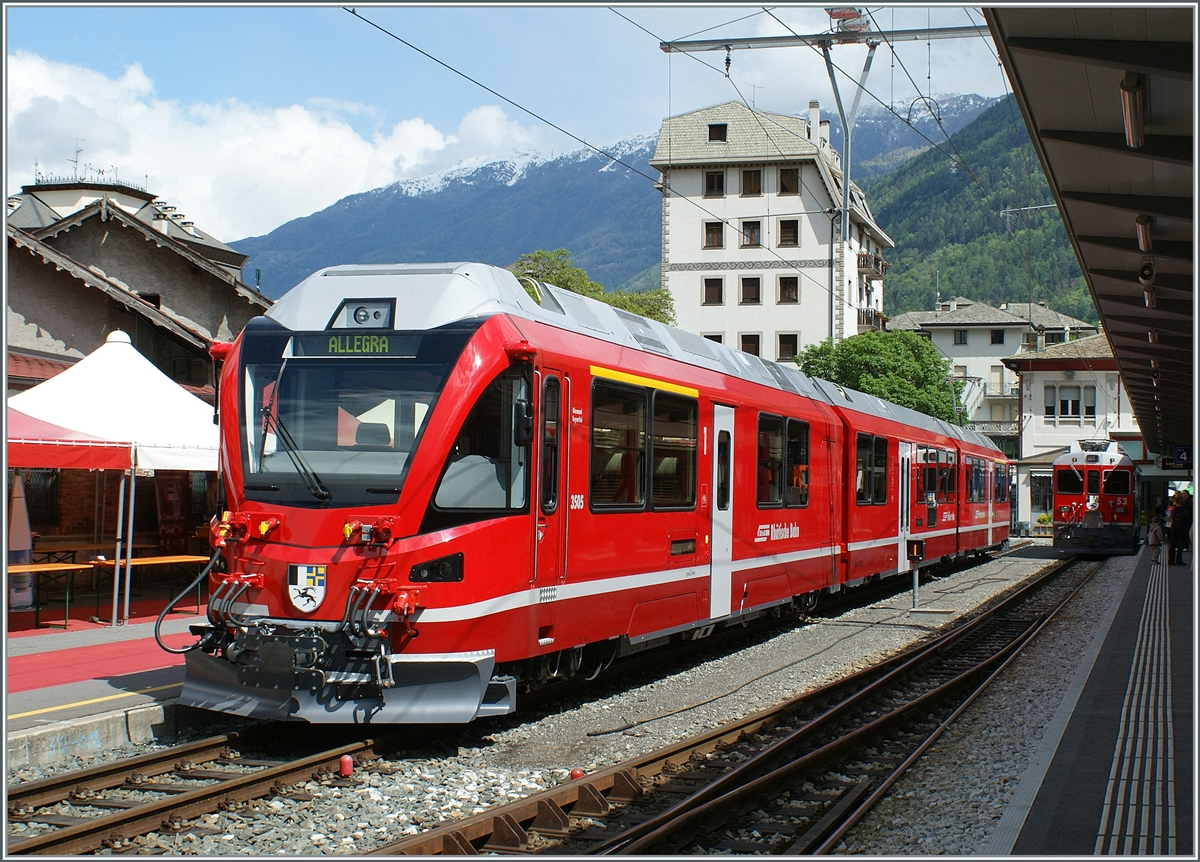 Rechts steht das RhB "Eselchen" 161 bzw. der Rangiertraktor RhB Ge 2/2 161, ex BB Ge 2/2 61. Hinten steht der 3-teilige RhB ALLEGRA-Zweispannungstriebzug (RhB ABe 8/12) 3515 "Alois Carigiet" mit 5 angehangenen Personenwagen zur Abfahrt als RhB Region nach St. Moritz bereit.