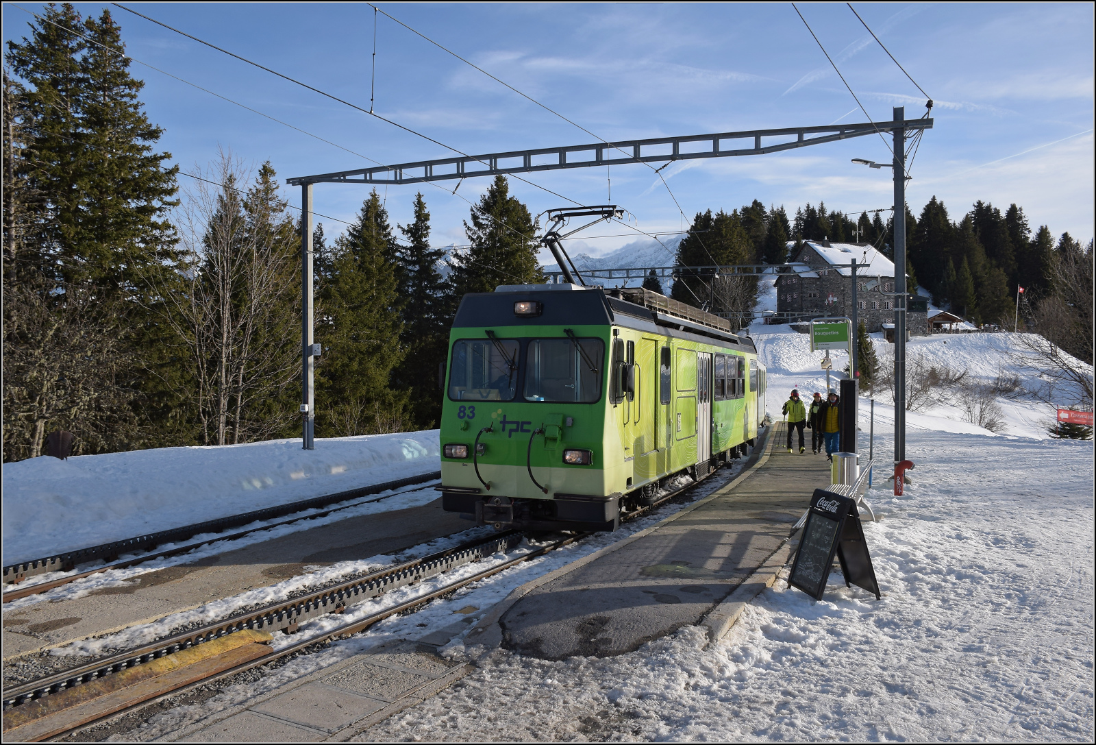 BDeh 4/4 83 auf Bergfahrt mit zwei Wagen. Dieser wurde 1987 von ACMV/SLM/BBC an die BVB geliefert. Die Führerstandsfront des Motorwagens ist ähnlich den zahnlosen Motorwagen von AB, CJ und FW gestaltet, die in den 1980er Jahren geliefert wurden. Angehängt sind die beiden (Ultraleicht-) Wagen B 66 und Bt 65 aus den Jahren 1983 und 1987 von den Herstellern ACMV/SIG/BBC. Bouquetins, Januar 2026.