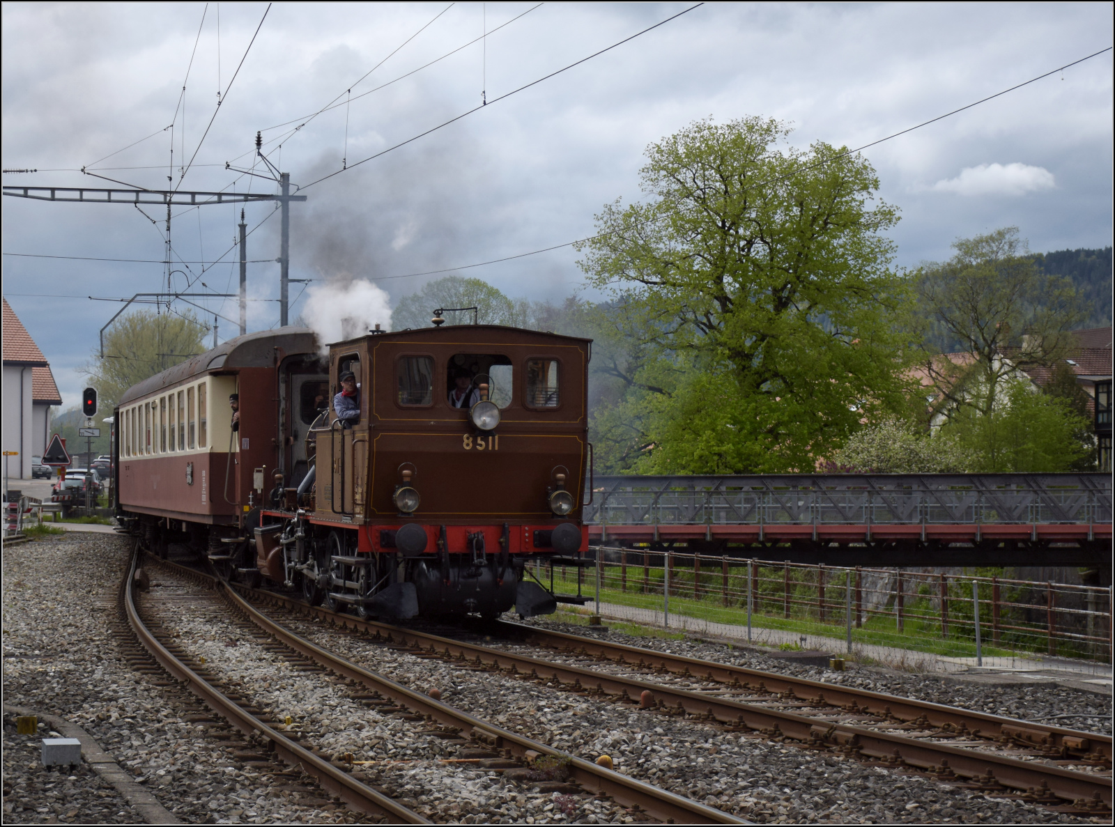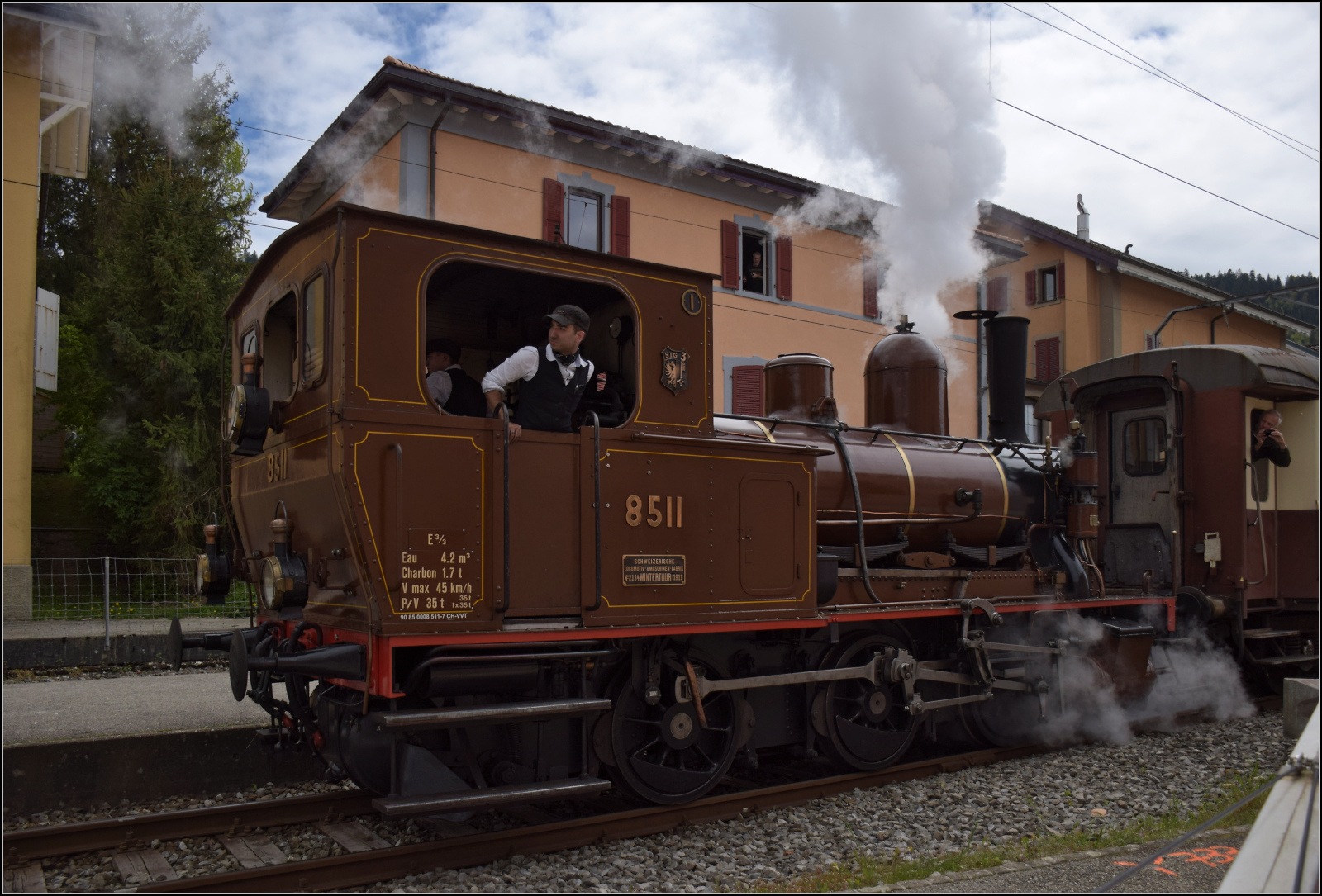 Der Historischer Triebwagen ABDe 2/4 102 der Compagnie du Chemin de fer Régional du Val-de-Travers fährt heute unter RVT-Historique. Baujahr war 1945, bis 2006 war der Triebwagen im fast unveränderten Origialzustand im Regelbetrieb. Couvet, Juni 2016.