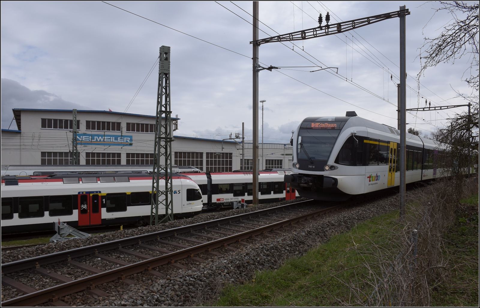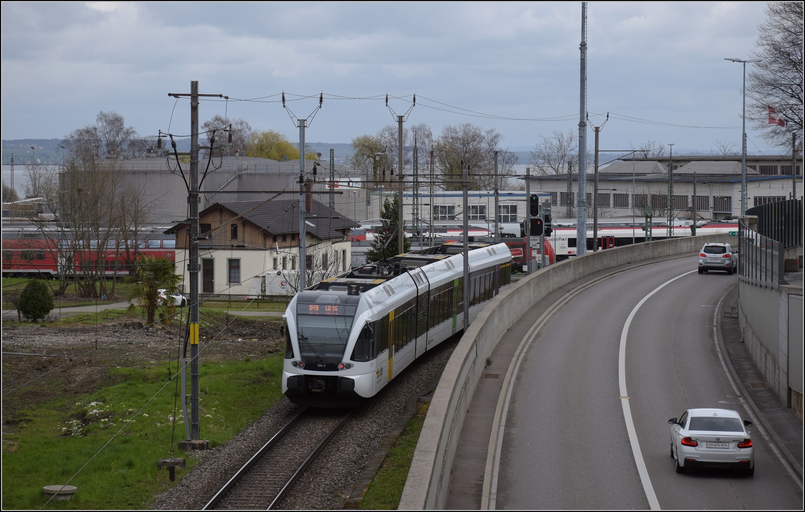 Seelinie Rorschach - Arbon - Romanshorn - Kreuzlingen - Stein am Rhein - Schaffhausen: Kreuzlingen am 16.August 2001. Im Vergleich zum Bild vom 5.Oktober 2021! Links Lok 477 909, rechts ein Pendelzug der damaligen Mittelthurgau Bahn.