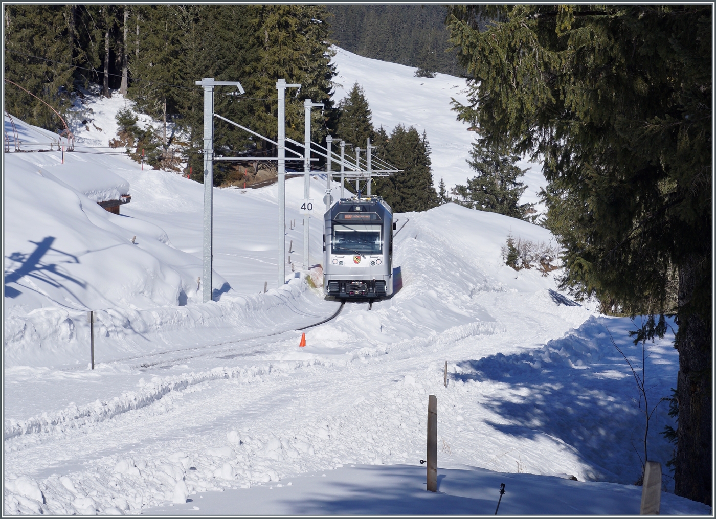 Ein BLM Triebwagen bei der Station Winteregg auf etwas halbem Weg zwischen Gütschalp unjd Mürren.