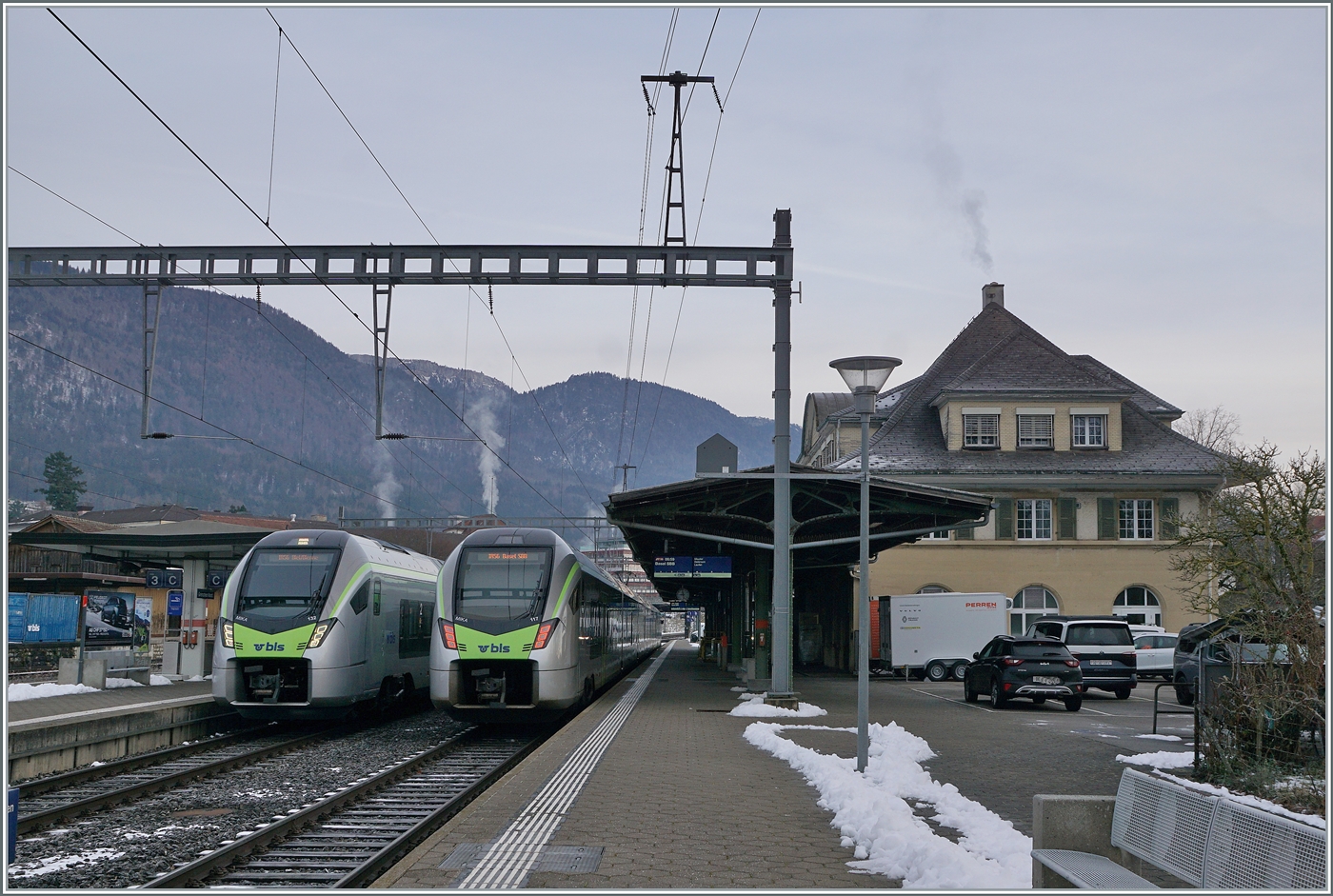 20 % mehr Reisende - Region Alpes kommt an ihre Grenzen und hat deshalb bei der BLS einen RABe 528 MIKA gemietet, der von MO bis FR zwei bis drei Umläufe abdeckt und so die dafür frei werdenden Domino-Züge zur Verstärkung anderer herangezogen werden. Das Bild zeigt den BLS RABe 528 109 in St-Gingolph der als R 91 6125 auf die Abfahrt nach Brig wartet. 4. März 2024