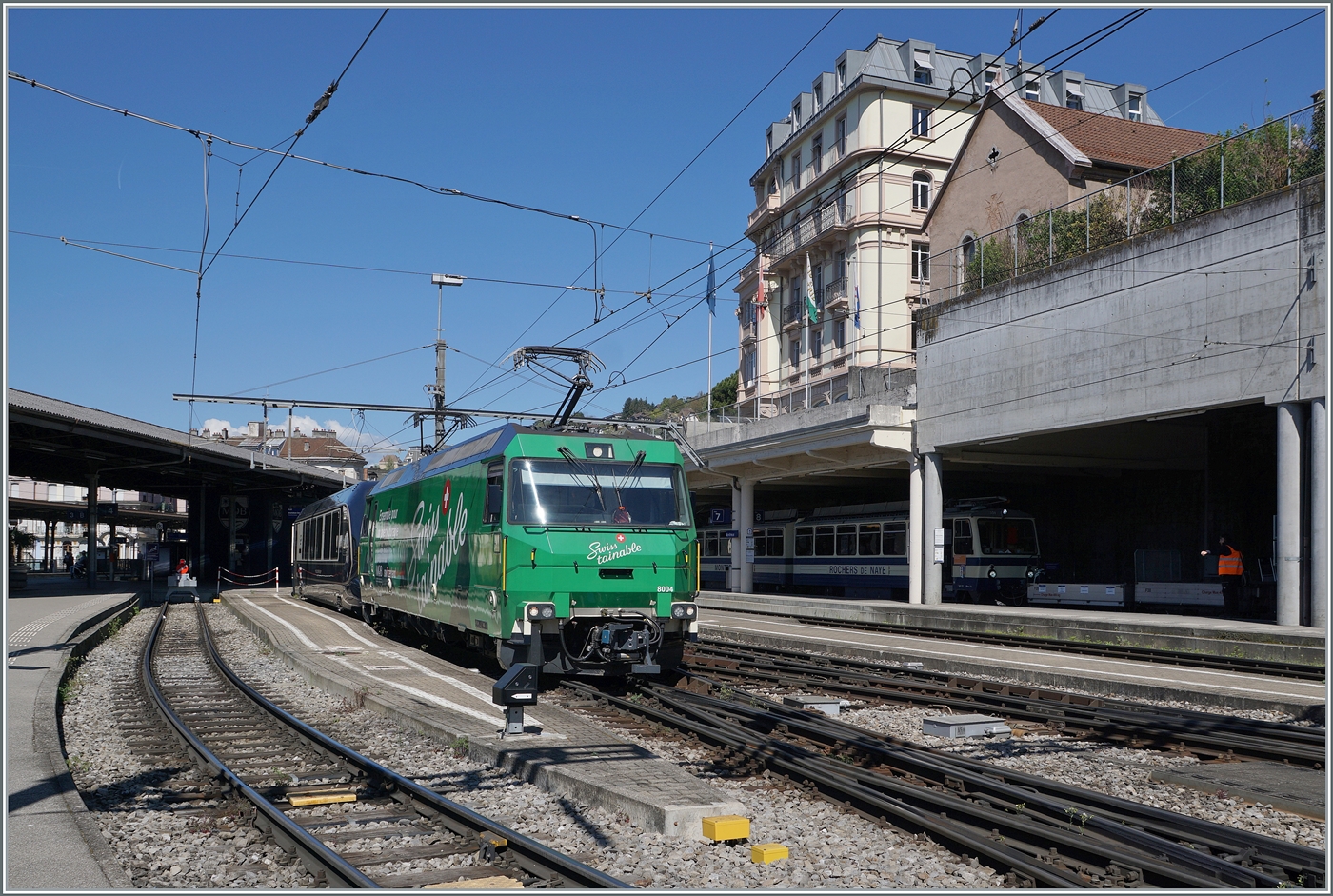 Ein MOB Panoramic Express mit dem schiebenden Alpina ABe 4/4 9302 verlässt Chamby in Richtung Zweisimmen.